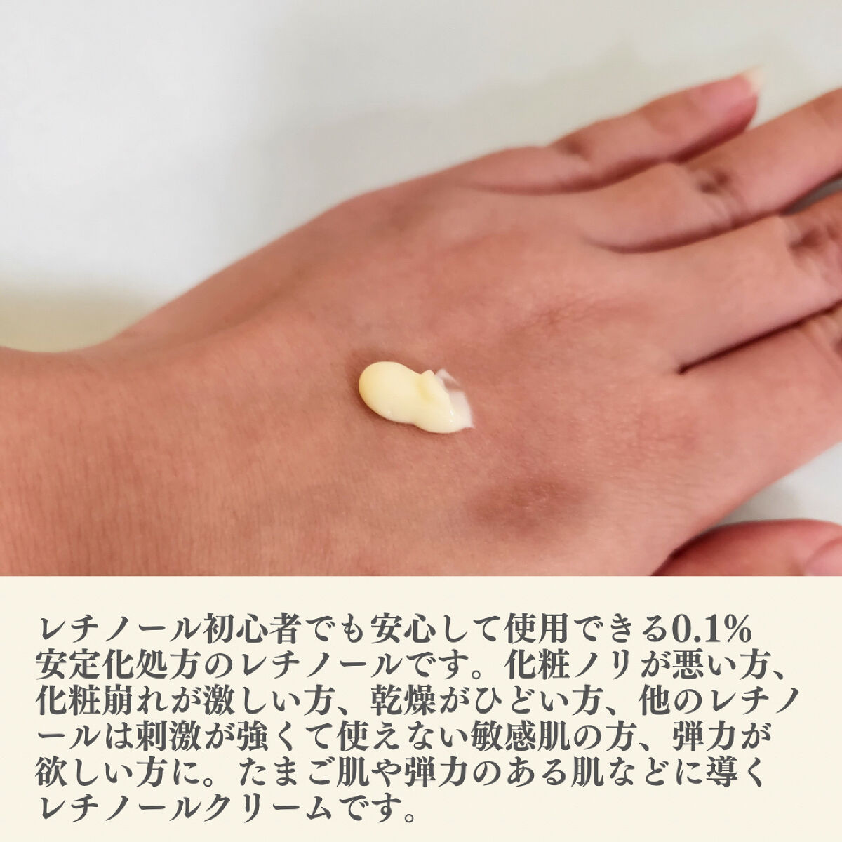 - #初心者向けのレチノール #初めてのレチノール ◎純粋レチノール0.1%安定化処方(保湿成分として) ◎お家で本格的な皮膚科学に基づいた保湿ケアが可能 ◎乾燥による毛穴目立ち/弾力/ハリにこだわりの保湿効果 ・「ノンコメドジェニックテスト(*1)」済み ・「敏感肌対象一次刺激テスト(*1)」済み ・「皮膚一次刺激テスト(*1)」済み 【こんな方におすすめ】 ・乾燥により目立った毛穴がお悩みの方 ・早めにエイジングケア(*2)を始めたい方 ・特に20代におすすめ ・時間が経つとメイクが浮き出る方 【注意事項】 ・アルミチューブの特性上初回オープン時に飛び出す可能性がございますのでご注意ください。 ・品質維持のため冷蔵保存おすすめ *1 )全ての方にコメド(ニキビのもと)や刺激が発生しないということではありません。 *2 )年齢を重ねた肌にうるおいを与えること