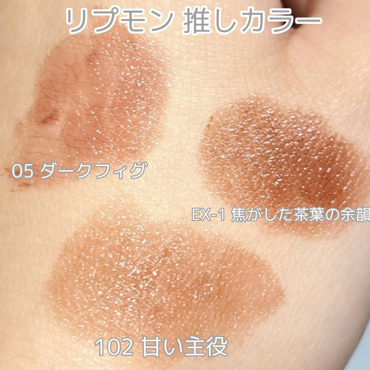黄み強めのブラウン。ほんのり赤みも感じられるお洒落で絶妙カラー🍂 焦がした茶葉の余韻っていう名前がユニークで面白い☺︎ 限定色っていうのが勿体無いくらい使いやすいブラウンリップです。