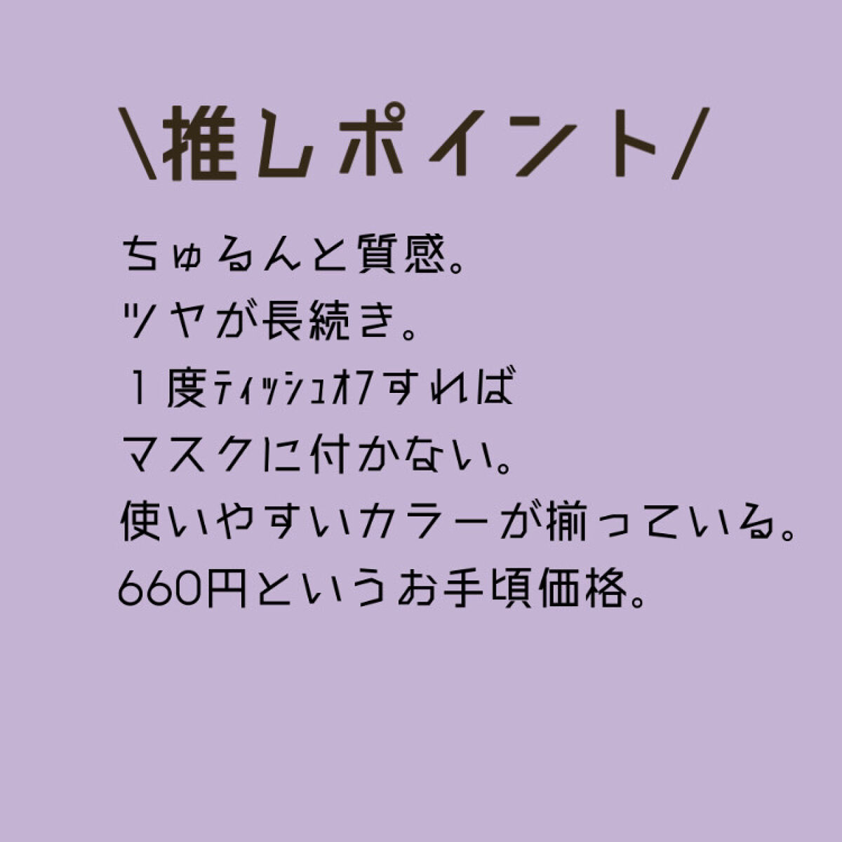 | 口紅・グロス・リップライナーランキング第41位 | めちゃくちゃ塗り心地が軽いのに、色のせてすぐティッシュOFFしても色がめっちゃ残る!! | 詳細を見る |