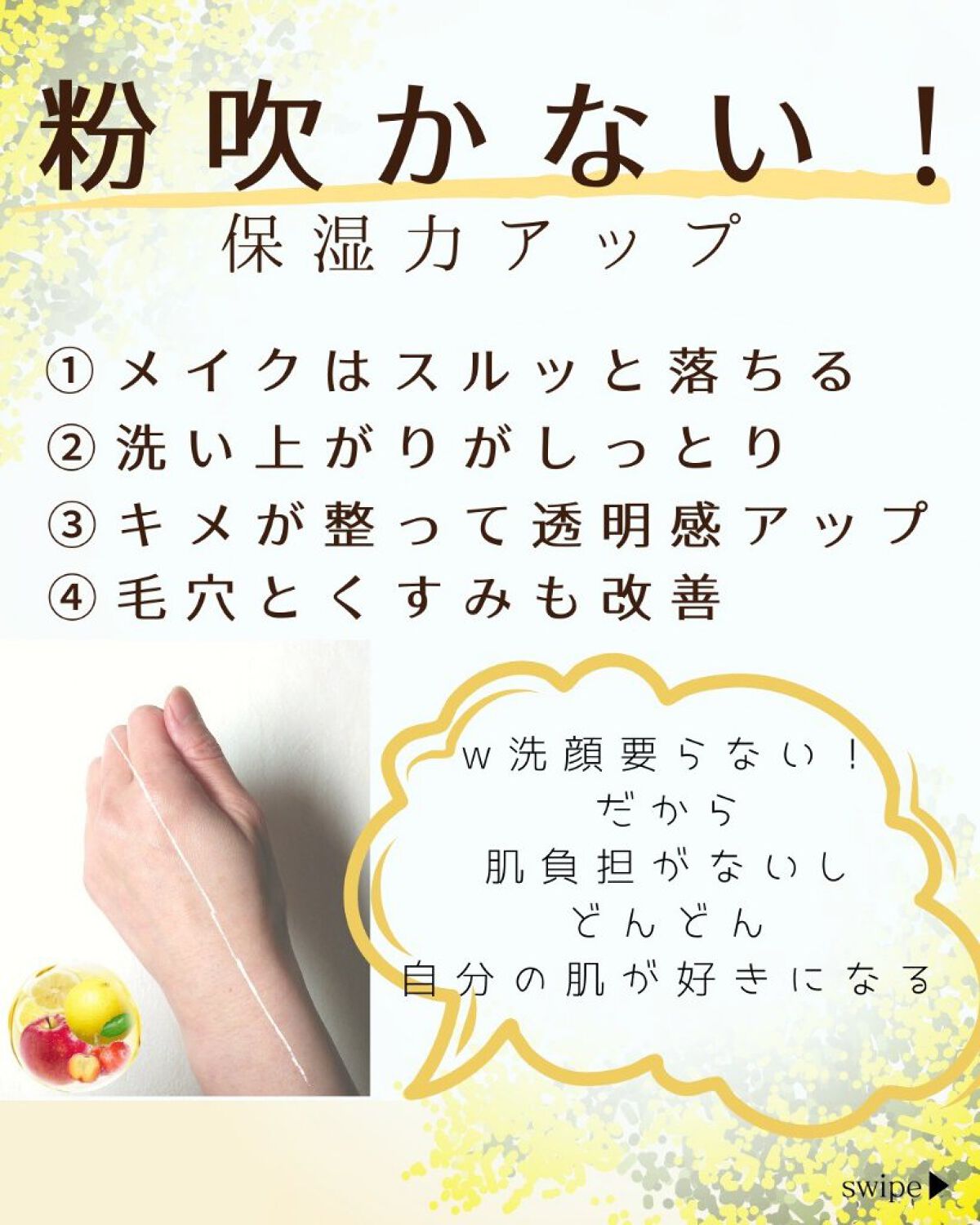 - フルーツエキス*をたっぷり配合!毎日使える新感覚**のスクラブクレンジング。 天然フルーツアロマの香りで、ぷるぷるの柔らかい球体スクラブが、肌に負担の少ない使い心地でメイクや毛穴の汚れ、古い角質をしっかりからめとります。これ1本でクレンジング×洗顔×スクラブ×マッサージ×角質ケアの5つの機能。ビタミンC*やCICA(ツボクサ)*、AHA*を配合しているため洗いながら肌を引き締め、お肌のうるおいや透明感にアプローチします。 *保湿成分 **ブランド内において