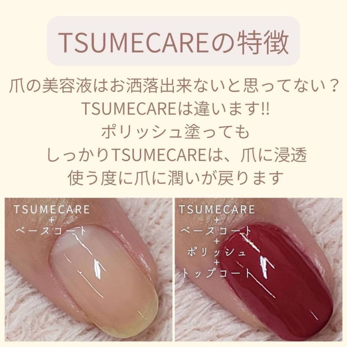 爪専用美容液「TSUMECARE」 爪のことを考え、爪によいもの 爪の成長に必要な 2種類のケラチンに ヒアルロン酸、セラミドも配合 爪が乾燥しやすい方は 素の爪に毎日重ね塗りし1週間後にオフ ネイルポリッシュを塗る方は ベースコートの前に塗布します TSUMECAREを ベースコートの前に塗布すると ピールオフベースコートを剥がした 爪の表面がなめらかで ちゅるんとキレイなままでびっくり ピールオフベースコートではない時も オフした後の爪の傷み具合いに 差が出ると感じました 水溶性で水仕事やお風呂で剥がれやすいので モチをよくしたい方は上からベースコートを 重ね塗りするのがおすすめです
