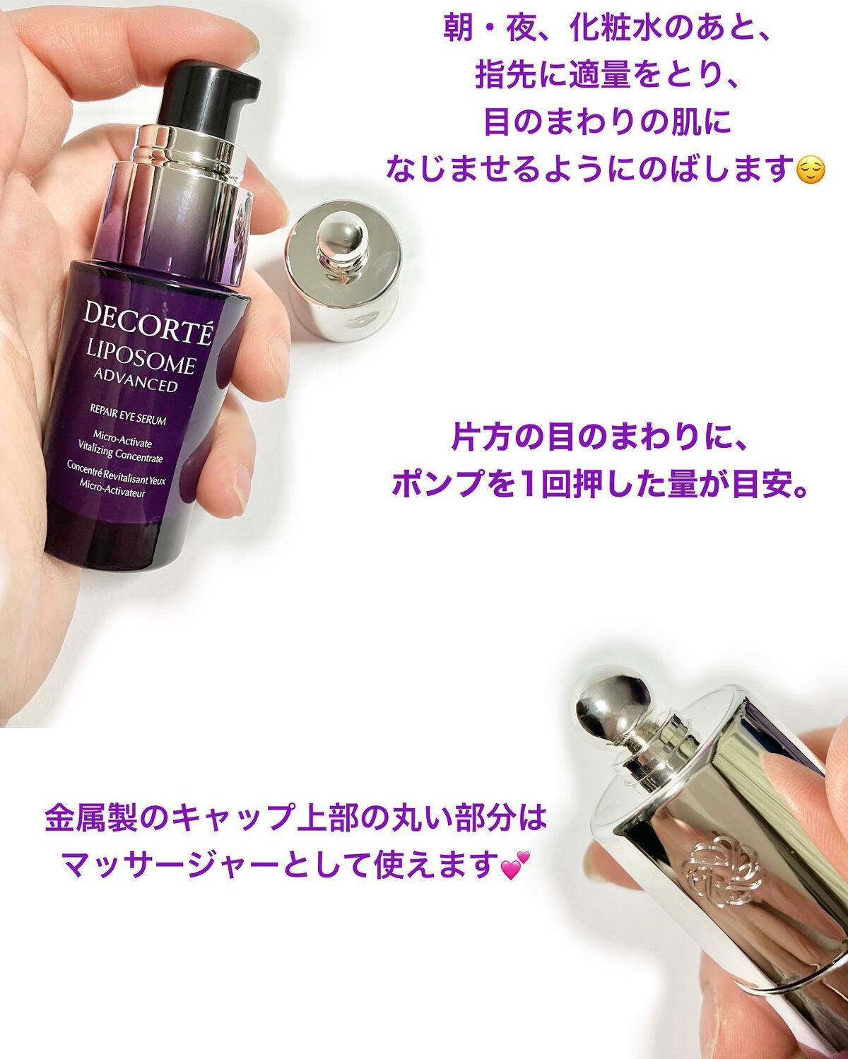 ⚠️サンプル使用での記録レビューです。コスメデコルテ リポソームアドバンスト リペアアイセラム(目元用美容液)コスデコリポソームの美容液を愛用してます。サンプルで目元用のも頂いたので使ってみた。テクスチャは乳液っぽい感じ。クリームでしっとりと...