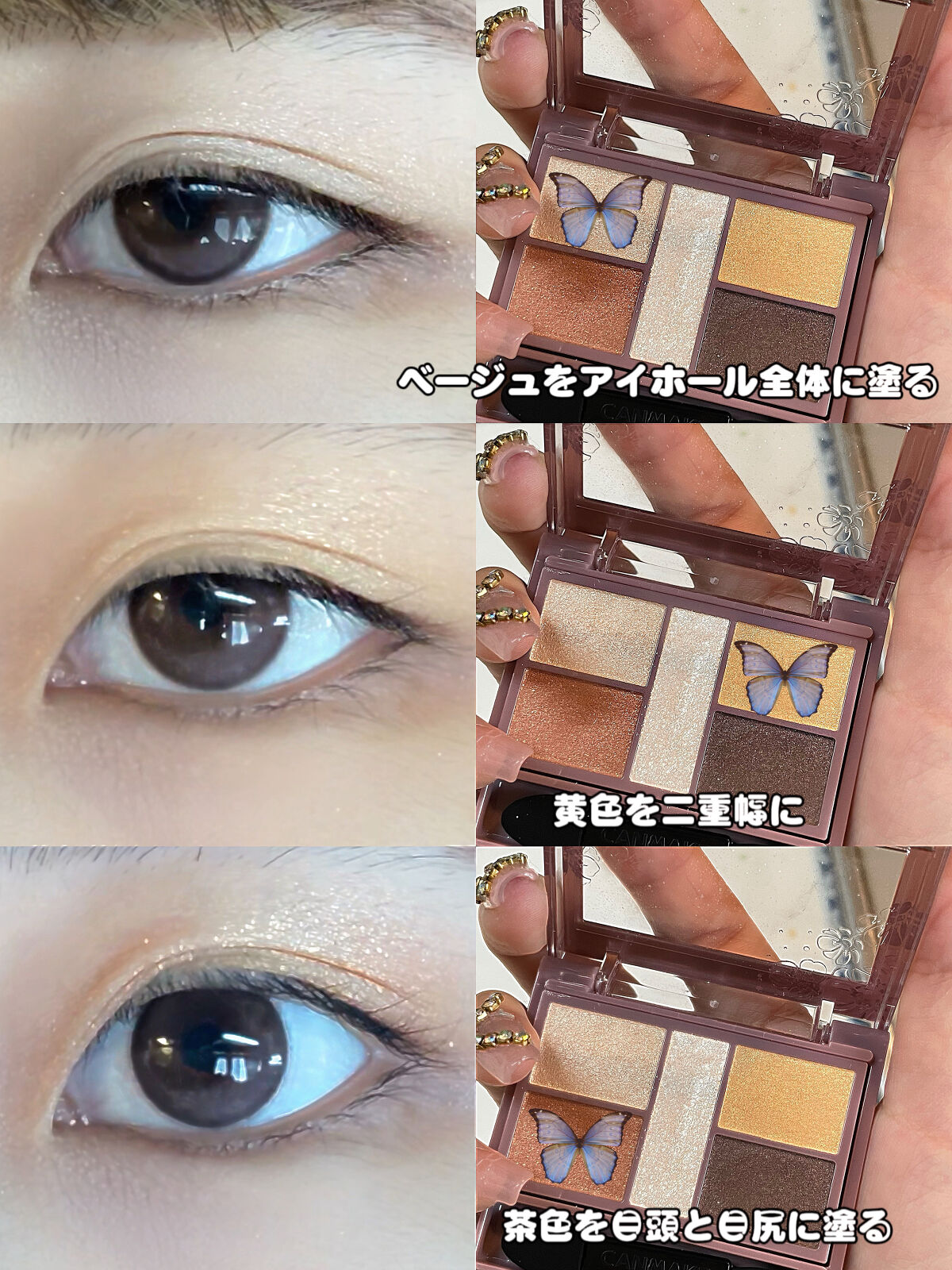 - 1枚のパレットで2つのスタイルが完成! 5色の欲ばりアイシャドウ♥ メインカラーを選んで2つのスタイルが楽しめる! A→B→D でスタイル1 A→C→D でスタイル2 繊細な粉質が、しっとりとまぶたに密着して色落ちを防ぎます。 透明感のあるキラうるトッピングジュエル(繊細ラメ)は、気分によってトッピング!