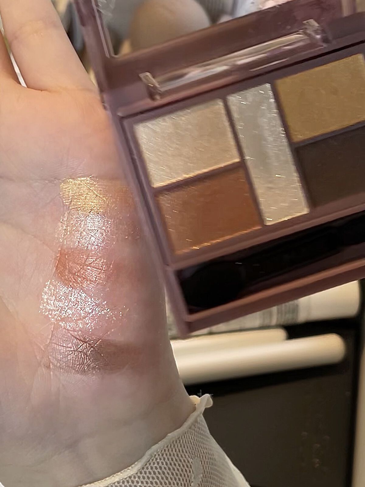 全6色❕ イエベ向きのくすみカラーです✊🏻 ̖́- ハイライトとして使える細かいパールと涙袋としても大活躍間違いなしのラメ❕ マットでサラサラ 触ってて気持ちいい🤪 筆だと肌に色が乗りづらいかもです😖🌀 特にラメは指でやらないと粉飛びしちゃいました 持ってていて損はないパレットだと思います⋆⸜🌷⸝⋆ お姫様の持っているコスメみたいでモチベ上がります🤍🫶🏻