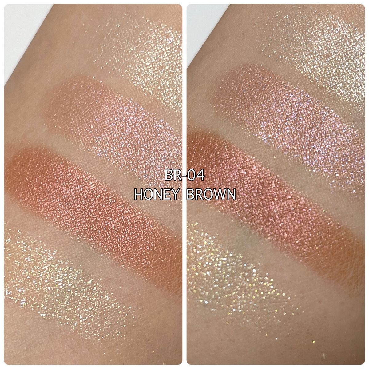 mude.の方がよりあたたかみのある印象で全体的に使いやすい色味が入っている感じ◎ ラメ感もギラギラするよりかは上品なキラキラ感✨ rom&ndはmude.に比べるとフレッシュな印象!春や夏に使うと映えそう❣️ ラメ感も強く、目立つかな。 似てるかもしれないからと買うのを長い間悩んでいましたが、仕上がりが全然変わってくるので、買って良かった😂❤️ 粉質はブランドも違うので違ったよ✨ rom&ndの方がしっとり感があって強く発色する感じ。 mude.は淡い発色で、初心者さんも使いやすいと思った🫶🏻