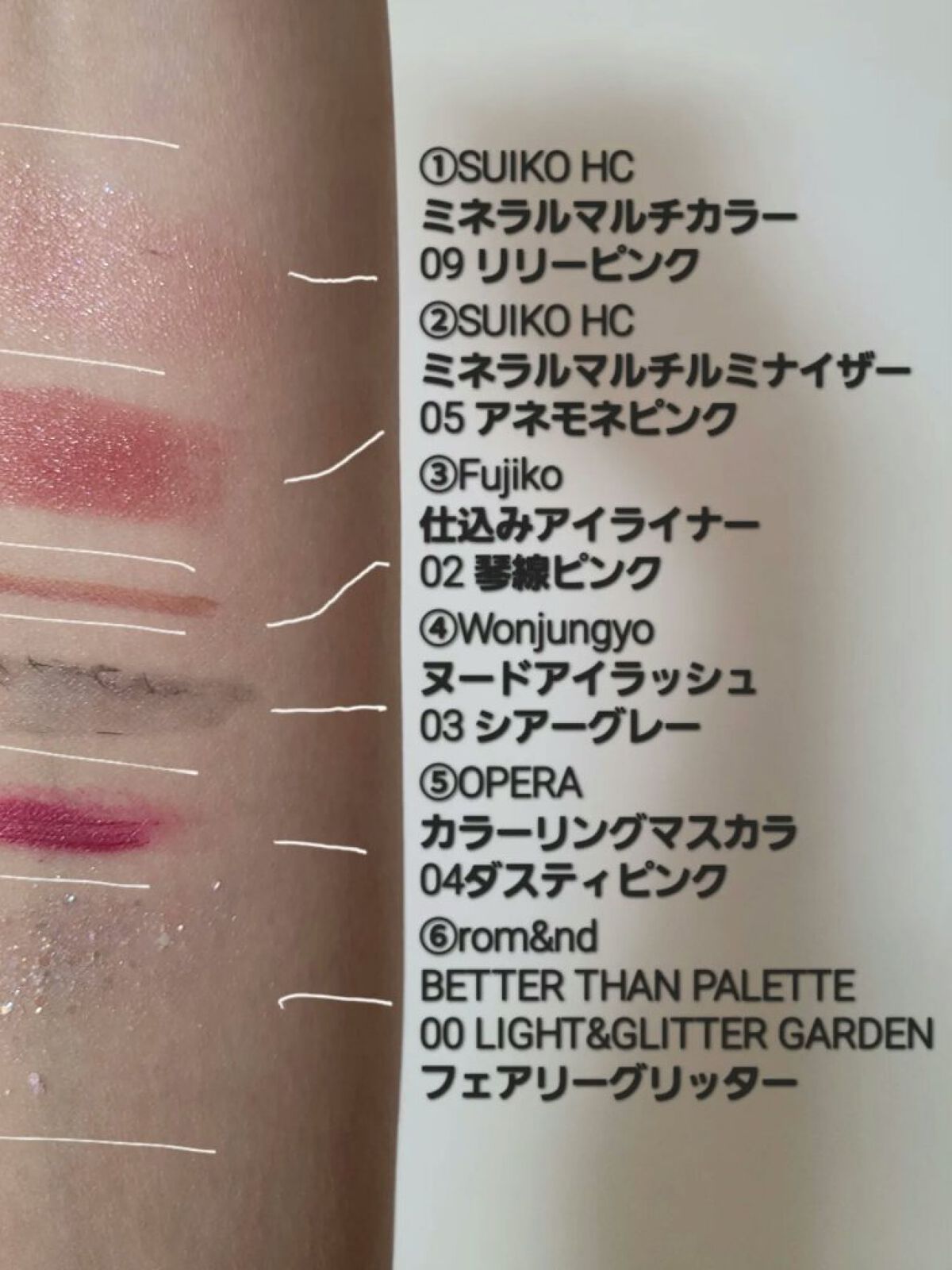 Suikoでモカメイク♡SUIKOミネラルマルチカラー10ロゼブラウンとミネラルマルチルミナイザー05アネモネピンクエアリーオーラプロテクションロゼ、ルミナスヴェールファンデーションをスウォッチ✨🌸Suikoミネラルマルチカラー10ロゼブラウ...