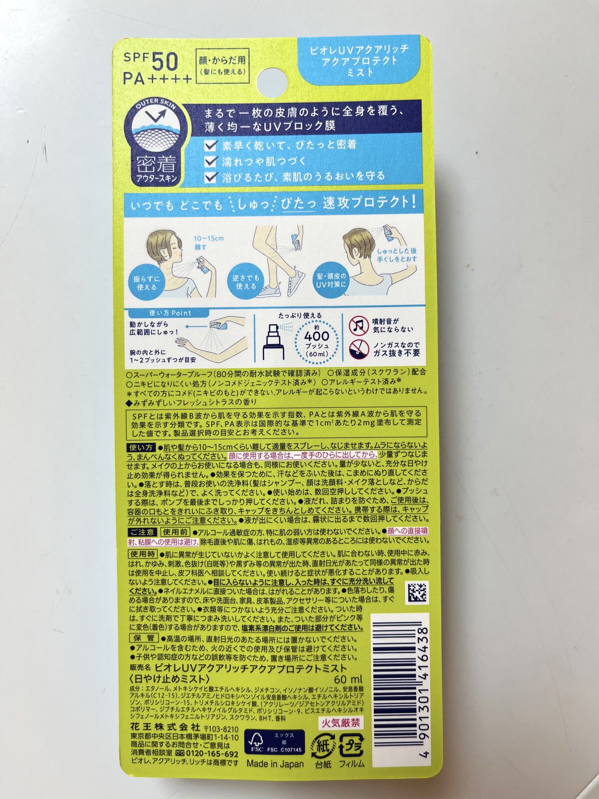 ビオレUVアクアリッチアクアプロテクトミスト ¥1,078ミストタイプの日焼け止め🧴☀️塗布したあとの感触は化粧水つけた後みたいにしっとりするよ片手でワンプッシュで塗布できて1人では塗りにくいところも簡単に塗布できる🌻塗布した後は軽く馴染ませ...