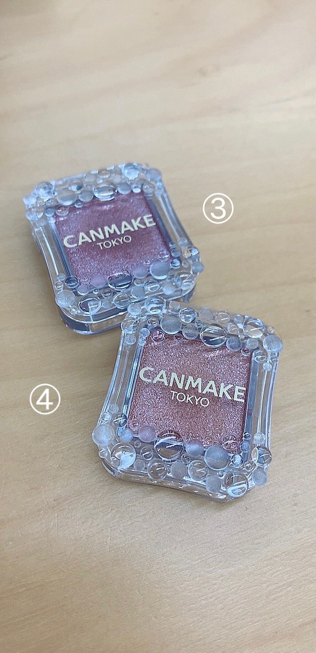 CANMAKEシティライトアイズ【使った商品】03オーキッドモーヴ【商品の特徴】¥638円(税込)高輝度ラメ配合【使用感】ややしっとりした粉質指塗りだとラメや発色をしっかりと感じ輝度や大きさもより感じやすいブラシ塗りだと透け感のある発色で血色...