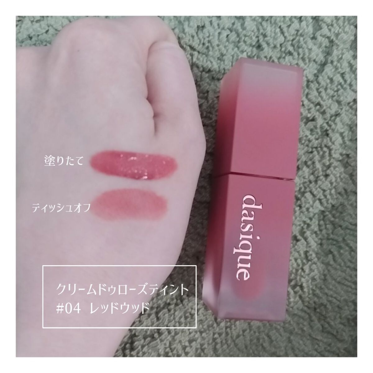 粉質は柔らかく発色は控えめでラメは全体的に大粒でギラギラするタイプでした。 手持ちのシャドウと組み合わせれば自分の好きなメイクが出来そうなので総合的には満足です。 マット特有のパサつきはあまり気にならず、下地なしでも荒れる事もなく快適に使えました。 色持ちは飲食をしなければマスクありでも半日持ったのでティント効果はあるように感じました。