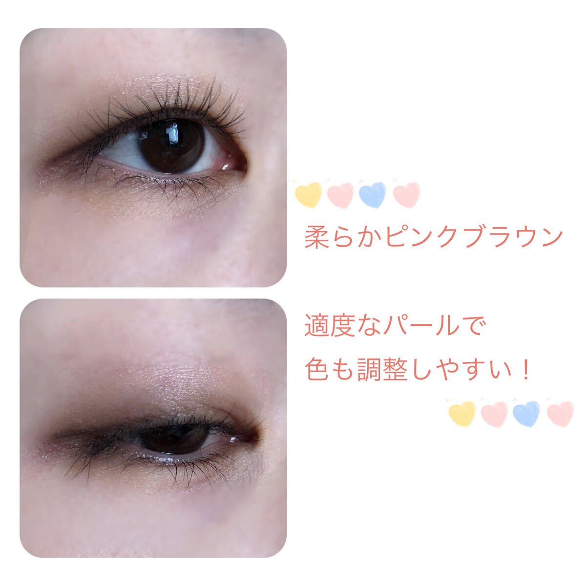 Aのみラメで、BCDはふんわりマットな質感です。 このパレットのラメはギラギラし過ぎずちょうど良いキラキラを付け足してくれるのでそんな失敗も心配なしだなと思いました!笑 Aはシルバーと少しピンクを感じるラメ Bは柔らかく発色するピンク C肌馴染みの良いベージュピンク D強過ぎない締め色ブラウン ソフトな色味ではありますが、付属のチップでしっかり発色してくれました! 締め色の柔らかめブラウンでふんわりとした雰囲気のあるピンクメイクに仕上がります🩷 私はBをアイホールと涙袋、Cは目を開けて見えるくらいまでと下まぶたの黒目下のアイライン代わり、Dをアイライン上に引き、最後に黒目の上下あたりにラメを乗せました! この適度に柔らかさのあるブラウンという締め色が個人的にはお気に入りで、今後も重宝しそうです…!!