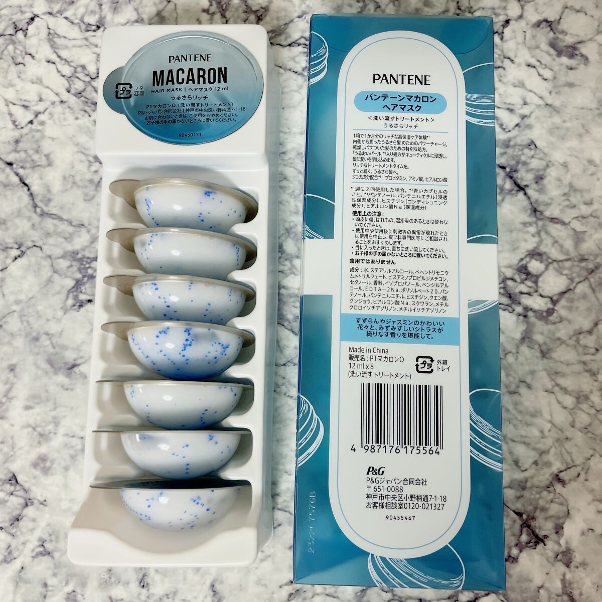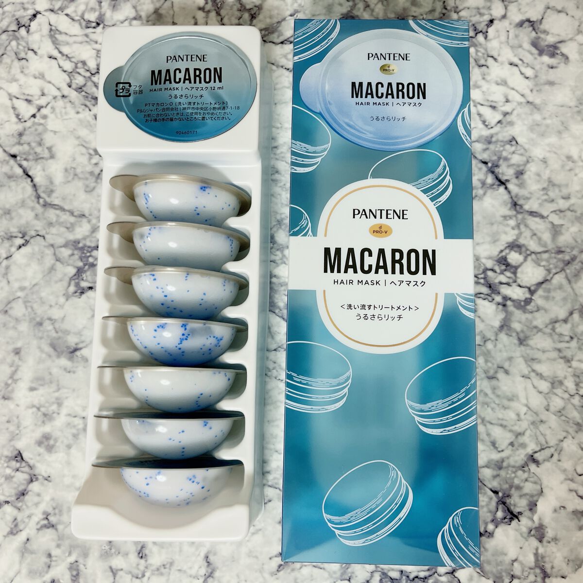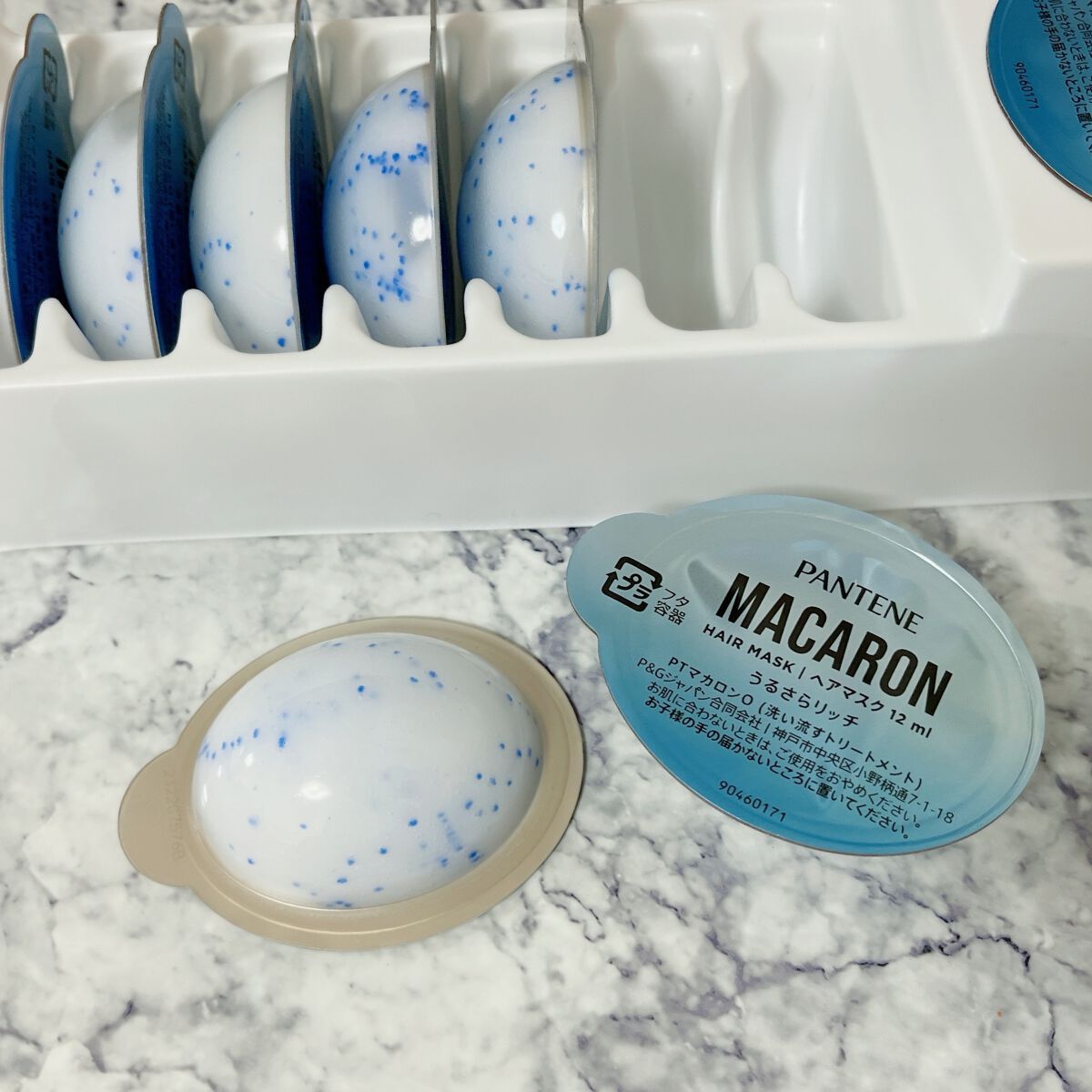 - 「パンテーン マカロン ヘアマスク」は、1粒に1回分の洗い流すトリートメントがたっぷり詰まった、使い切りタイプのヘアマスクです。 パンテーン マカロン ヘアマスク うるさらリッチ(洗い流すトリートメント)は、1箱で約1か月分のリッチな高保湿ケア体験*。乾燥しパサついた髪のための特別な処方です。 「メルティうるおいパール*2」配合で、ぷるぷる保湿成分がキューティクルに浸透し、髪にうるおいを閉じ込めます。ヒアルロン酸、プロビタミン、アミノ酸の3つの成分を配合*3した処方です。 1回分が、とろとろ浸透・熱ダメージをリペア。軽やかうるさら髪へ! いつでも開けたて、フレッシュな洗い流すトリートメントをお楽しみください。個包装だから持ち運びOK。ジムやサウナ、お泊り会、旅行・出張など、様々なシーンで使うことが出来ます。 * 週に2回使用した場合。*2 青いカプセルのこと。 *3 ヒアルロン酸Na(保湿成分)、パンテノール、パンテニルエチル(浸透性保湿成分)、ヒスチジン(コンディショニング成分)
