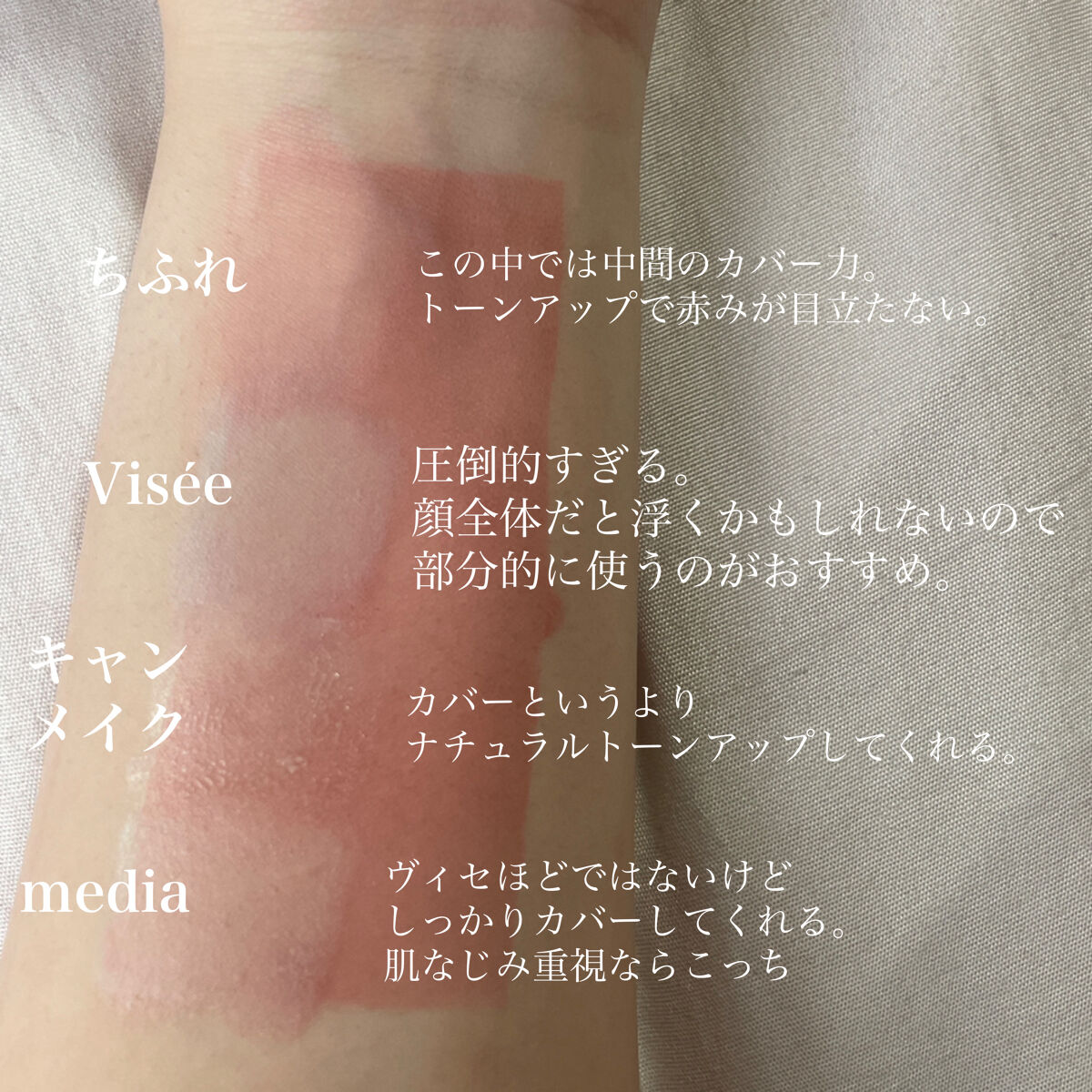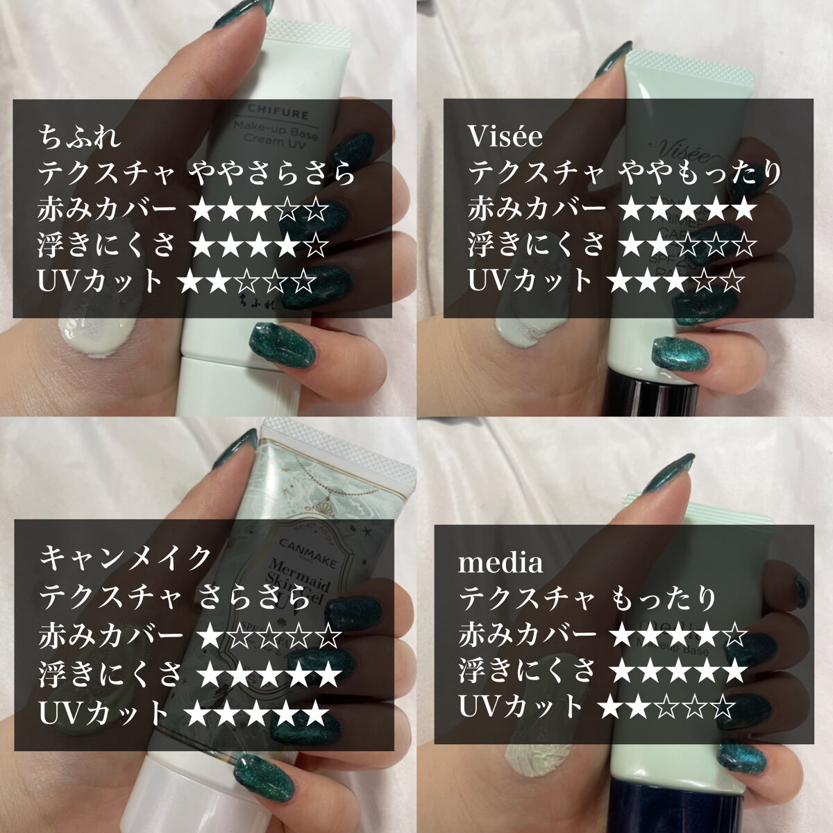 肌の赤みは緑系でカバーできる! 顔色悪くならないかな? ホントに赤みが隠れるのかな? プチプラでいいのないかな? 何を選べばいいのかわかんない> 今回は1000円(税抜)以内で買える緑系下地比較してみました! ちふれメーキャップ ベース クリーム UV グリーンViséeトーンアップ プライマー ケア グリーンキャンメイクマーメイドスキンジェルUV CICAミントmediaメイクアップベースR グリーン テクスチャ、特徴、赤みカバー力などそれぞれまっったく違うので好みの下地を見つけてみてください💚 ぜひ参考にしてね💚