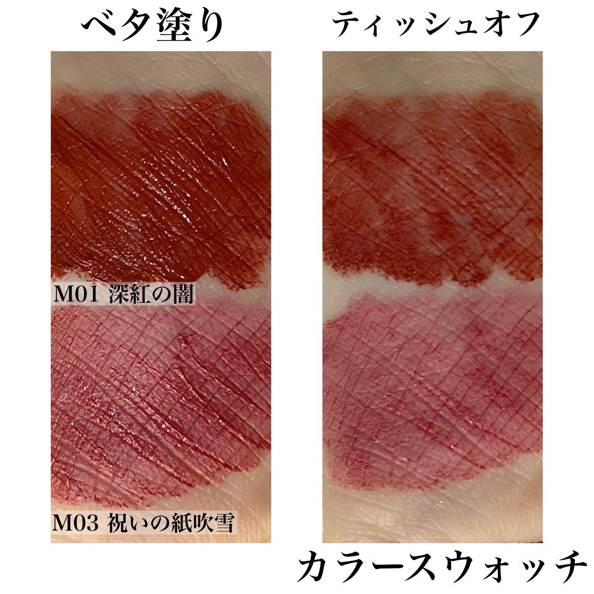 #提供❁.˚‧º‧‧º·˚.❁ リプモン スフレマット 4色スウォッチ❁.˚‧º‧‧º·˚.❁KATEリップモンスタースフレマットをお試し✧*˚₊‧ੈ✩おすすめポイントੈ✩‧₊˚*⋆つけたての色が長時間持続⋆ふんわりマット質感に変化する落...