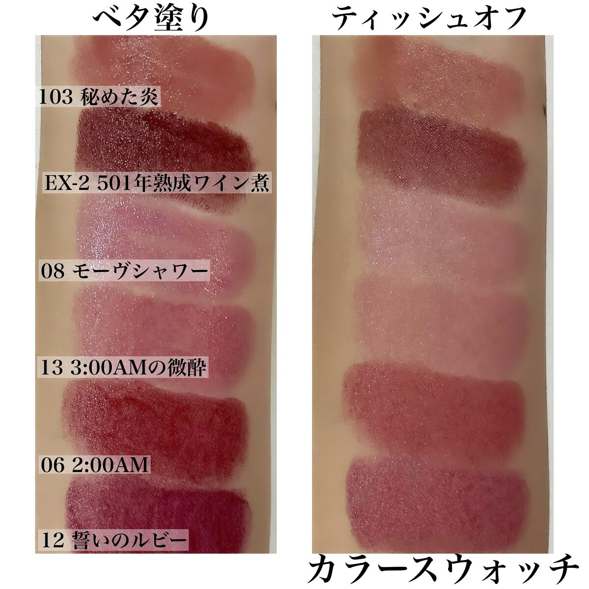 このカラーは深い赤味のあるピンク。 ツヤ感もあってメイクした!って感じになる🥺 ティッシュオフすると色味も落ちるけど、ツヤ感はそのままで落ちても汚くないの。 濃いめのカラーでもムラにもなりづらくするする塗れる✨ 13番はすっぴんでも合わせやすいけど、12はメイクしてないと唇だけ目立つかな。 ナチュラルメイクやすっぴんの時に使いたい人は13。お出かけやお仕事で使いたい人は12がおすすめ。 プチプラでこのクオリティすごいよ… バズリップなだけある。 見つけたら即確保だよ!🤔✨