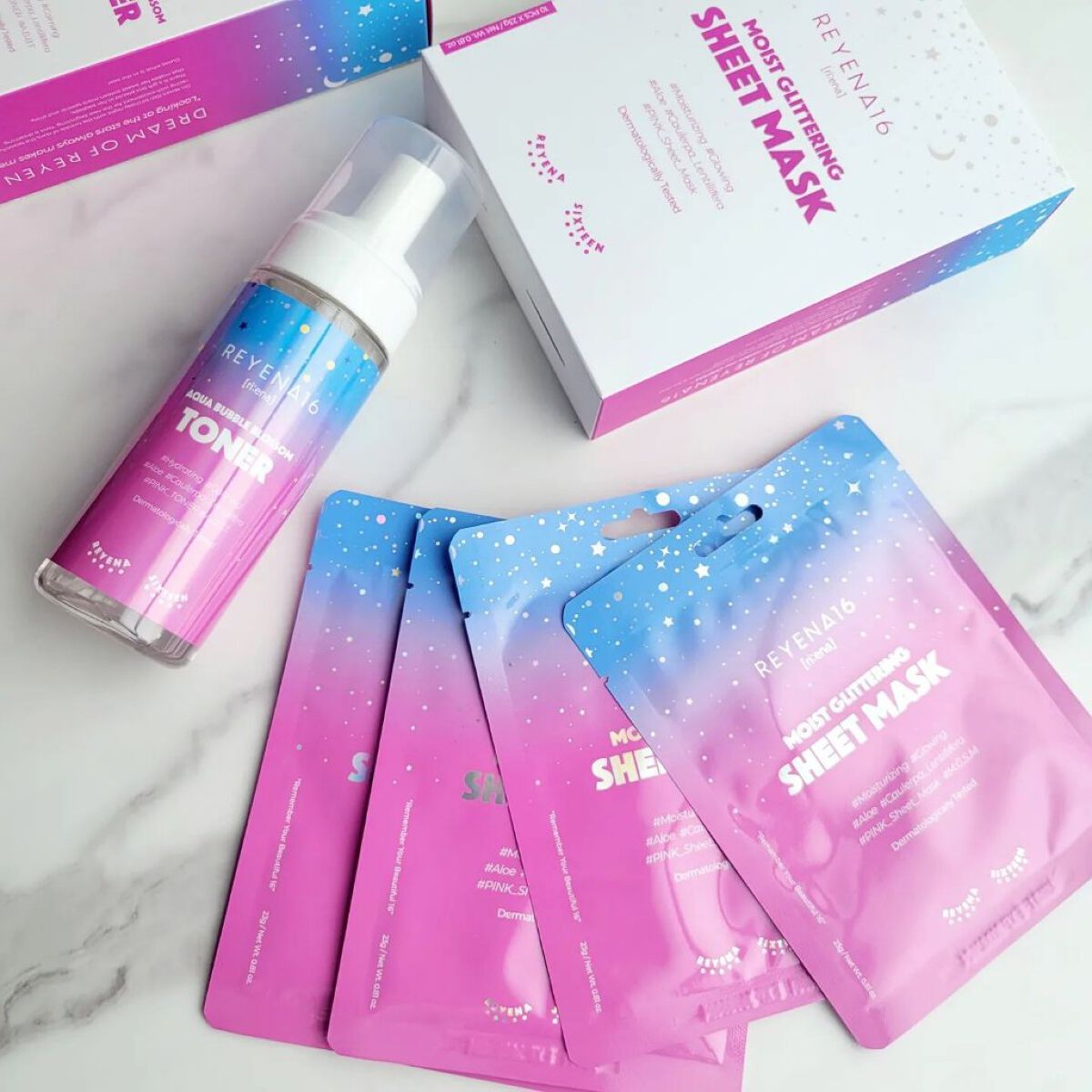 グリッターマスク、新しい✨ こんなに可愛いマスクは初めてで、 テンションあがりました♡ シートに含まれたトナー量も十分すぎるほどで、 マスク後にもさらに一回保湿できちゃうくらい 袋の中に美容液がひたひたに入っています。 保湿力も申し分なかったです。 バブルが初めはしっかりしていて、ダレないのですが、 肌に乗せてしばらくすると体温で溶けてきます。 お風呂上がりにすぐ保湿したい時 バブルを頬、額、鼻、顎にちょんちょん乗せて サッと伸ばせば即保湿できちゃうところが、 とっても便利で気に入りました♡ 液体タイプのトナーは手でバシャバシャつける時に 流れ落ちてしまったり、 コットンにつける手間がいるのですが バブルだとそんな煩わしさがなく こんなに便利なんだ🥹💕と、感動しました。 香りは少し強めかもしれませんが、 キメも整ってお肌の調子も良きです♡