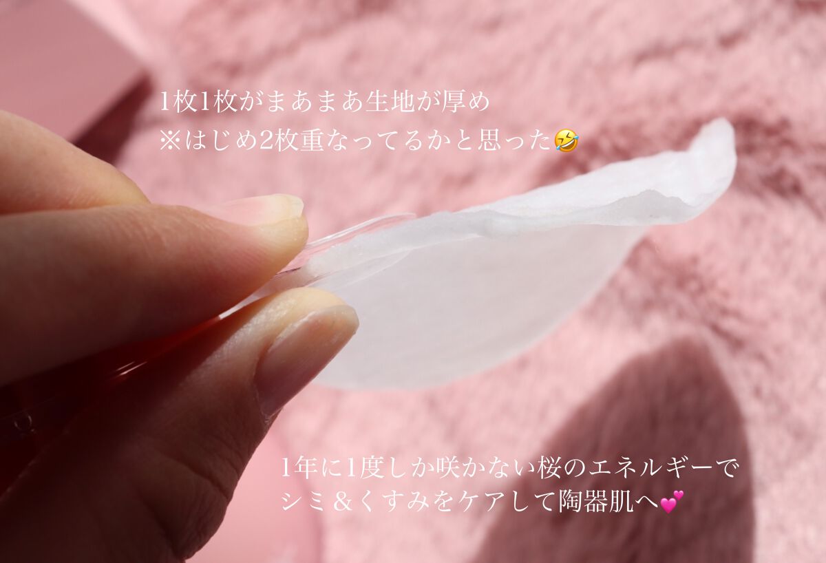 独自研究の桜フィトプラセンタ、桜エキス配合のアンプル1本をそのまま詰め込んだトナーパッドで シミ&くすみをケアしてなめらかな毛穴に仕上げてくれます😍 驚いたのはパッド1枚がとても分厚いこと✨ 平均的なトナーパッドの2倍くらいありそうなパッドに 液がたっぷり含まれているので朝の洗顔後の拭き取りなどにおすすめです☺️ 桜の良い香りもほのかにして 今の季節にぴったりです🌸