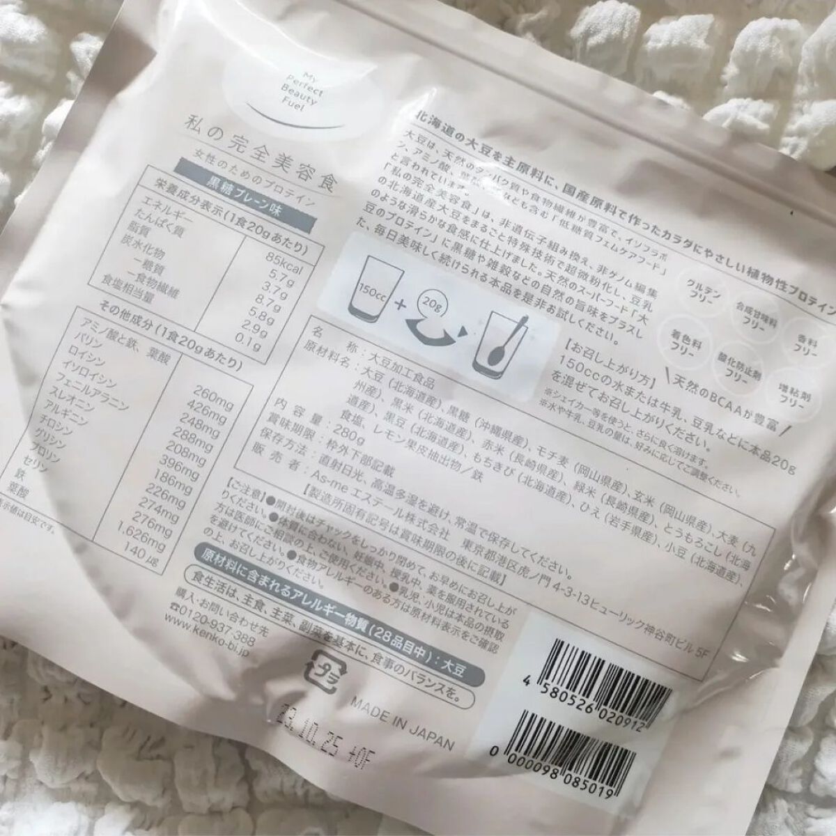 使っているのは、北海道の国産大豆✨ 非遺伝子組み換え・非ゲノム編集の大豆です❢ 厳選した国産食材を使用❢ 人工甘味料など余計なものは入れていません👏 マイクロパウダー化して、プロテインの溶けやすさを追求しました❢ さっと溶け、なめらかな口当たり、また、消化吸収にも優れています✨ 女性のことをすごく考えて作られていて、健康にも美容にもいい❢ しかも、国産の大豆で作ったというとても嬉しいプロテイン✨ 黒糖のほんのりとした甘さが美味しい❣ 黒糖って、普通の白砂糖に比べてとてもコクというか、深みがありますよね。 あとは、飲み物にすごく溶けやすいんです👌 だからか、さらっと飲めます 専用のコップとスプーンがついていること♥ しかも、よくあるプロテイン用のやつってあまりお洒落じゃないけど😂 こちらは、とても可愛いんです❢ 専用のコップとスプーンが付いてくるのって、とてもいいですよね😌