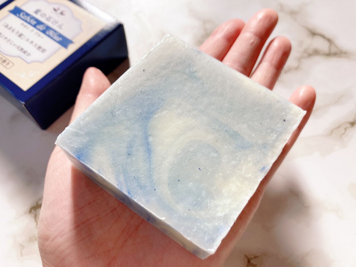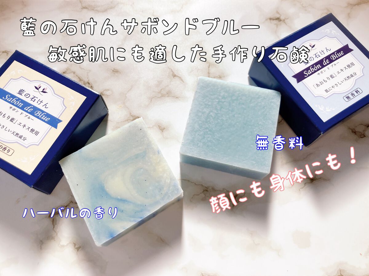 こちらはあおもり藍エキスを使った天然由来成分の石けんです✨ マルセイユ石鹼と同じ3つのベースオイルであるオリーブオイル、ココナッツオイル、パームオイルが洗いながらも保湿をしっかりとしてくれます✨ まず無香料タイプの真っ青な石けんを洗髪に使用してみました✨ そしてハーバルの香りがするマーブル柄の石けんは体を洗うときに使用してみました✨
