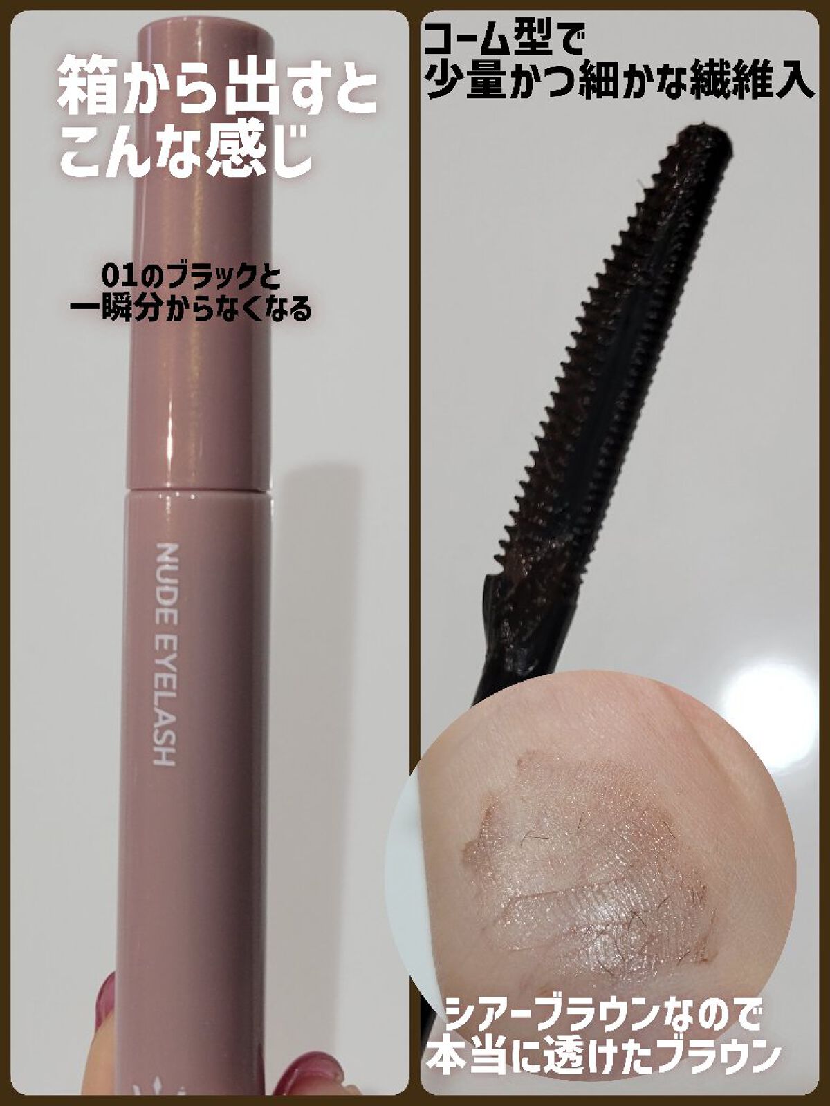 01シアーブラックを初めて使った時に感動し ヌードアイラッシュは基本的に売り切れてるので… 03のシアーグレーをGETしたのですが 太陽に透かすと03シアーグレーは やはり液が半透明のブラウンで 繊維は黒なので 色味に大きな差はなく ブラウンでも繊維が黒なので目力が死なないのも◎ カールキープもお湯落ちとは思えないくらい良い、 ダマにもならずスっとキレイなセパレートまつげが 簡単にできてとっっってもお勧めですわ…!