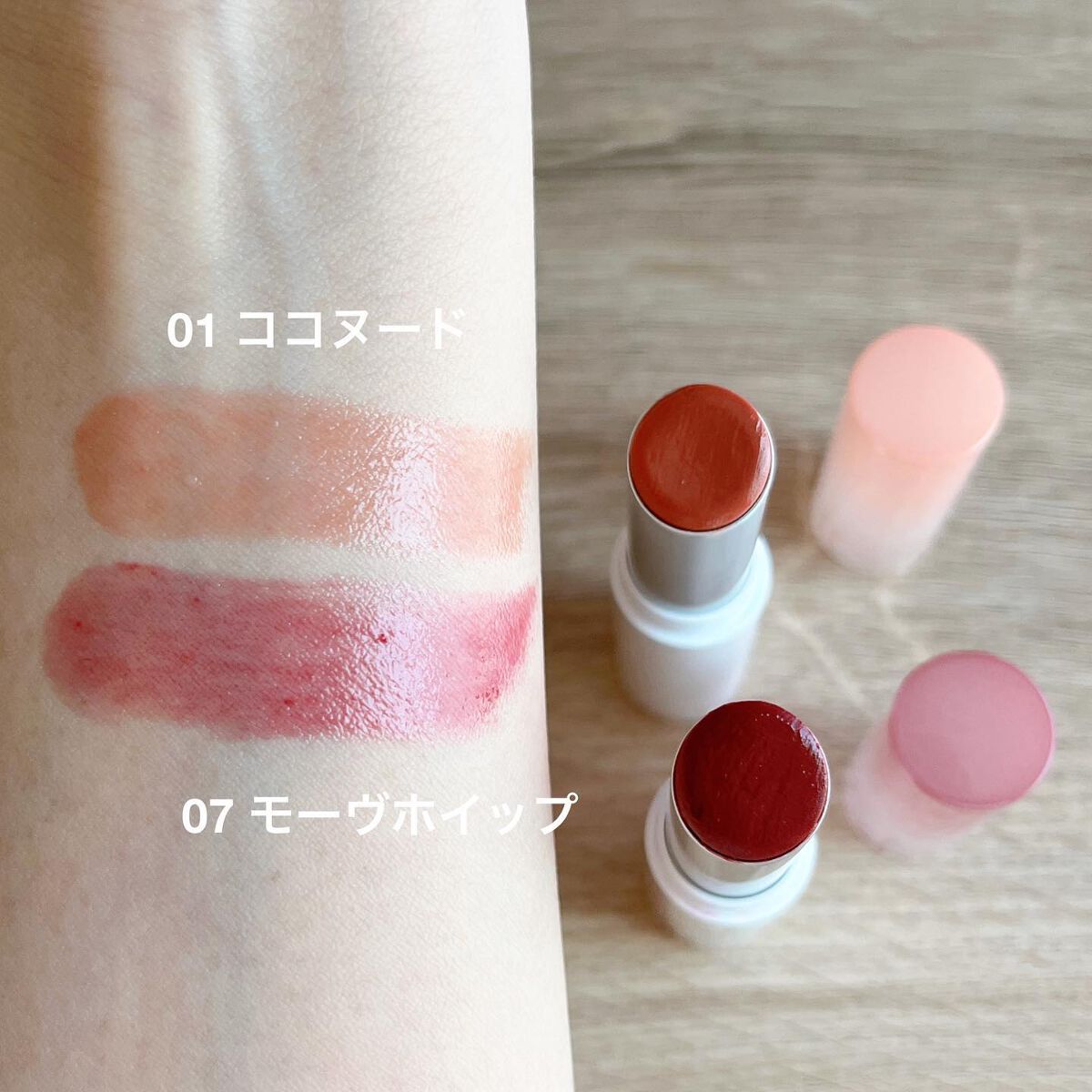- もちっとした水膜で弾けそうなツヤリップ 1.軽い塗り心地のなめらかで透明な水爆弾ツヤ 2.塗った瞬間から唇を鮮やかに彩る多彩なカラーバーム 3.植物性保湿オイルでしっとりもっちり保湿バーム