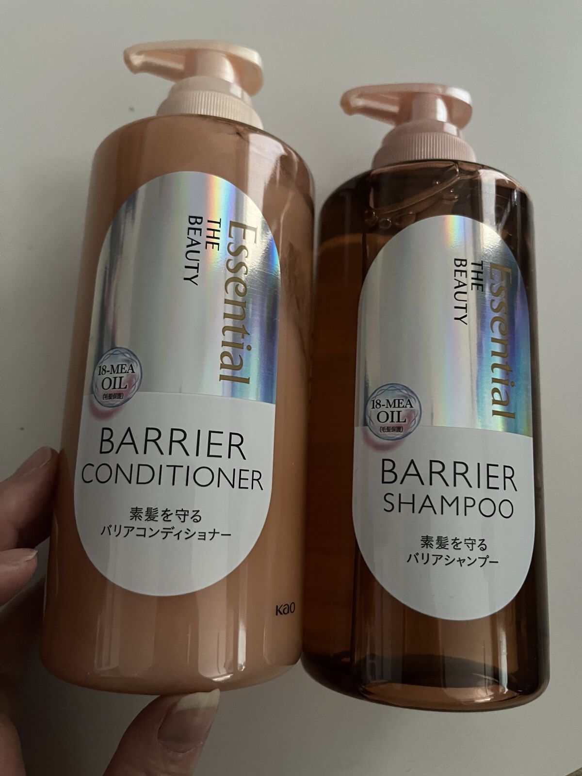 エッセンシャルプレミアムバリアシャンプー・コンディショナーシルキー&スムース〈説明〉・シャンプー・コンディショナー・450ml(両方とも)〈感想〉ホワイトピーチ&ムスクの香りは良い匂いで良かったです。シャンプーの洗浄力には私的には満足しました...