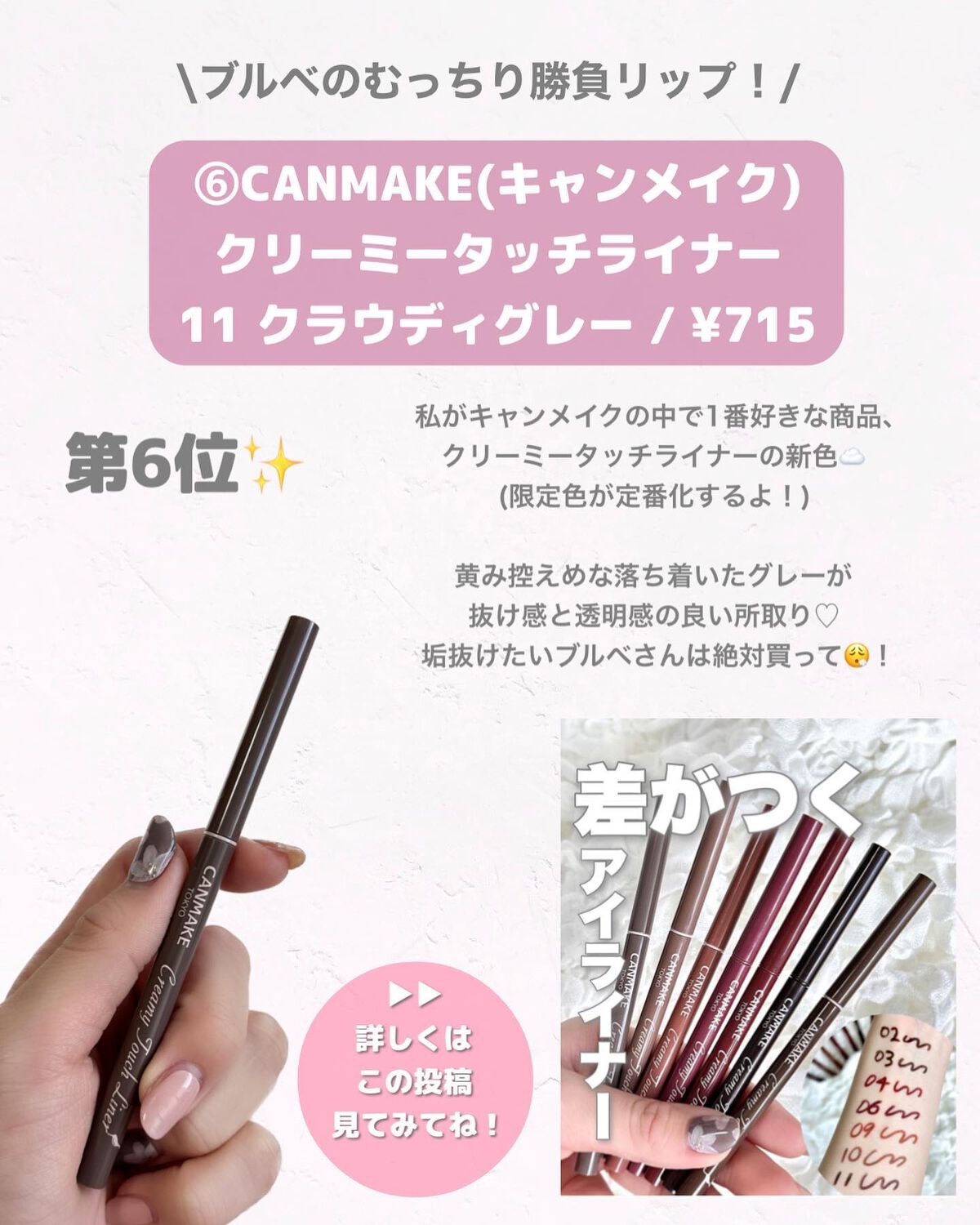 | ジェルアイライナーランキング第6位 | とろけて固まる描き心地が描きやすい👌カラーによってメイクの印象が変わってメイクを楽しむことができるアイテムだと思う! | 詳細を見る | |
