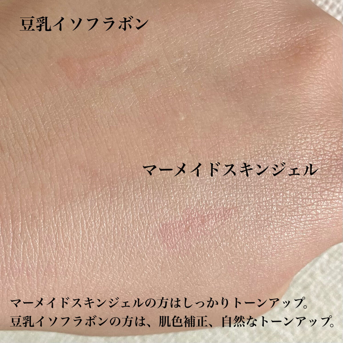 どちらもみずみずしく、使いやすいです。特に、豆乳イソフラボンの方がよりみずみずしく、保湿力を感じました。私は乾燥肌寄りなので、豆乳イソフラボンの方を愛用しています。 しっかり化粧下地の段階から肌をトーンアップさせたい方は、CANMAKEのマーメイドスキンジェルUVをおすすめします。 コスパ重視、がっつりトーンアップはちょっと、、、という方は、マーメイドスキンジェルUVの透明タイプをおすすめします!!