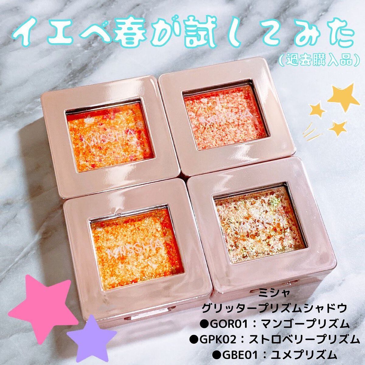 ※2023年1月開封品 アイシャドウ・商品名MISSHA(ミシャ)グリッタープリズムシャドウ GOR01マンゴープリズム GVL02パフュームプリズム・値段定価1320円(マンゴー500円、パフューム660円で購入)・購入場所ツルハ・評価★★...