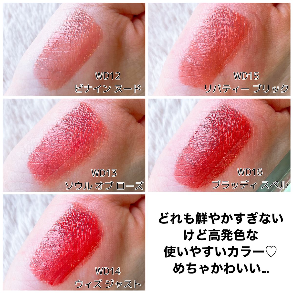 - <WD2 ビトゥン ローズ> 水、ジフェニルジメチコン、リンゴ酸ジイソステアリル、ビスジグリセリルポリアシルアジペート-2、水添ポリイソブテン、ジグリセリン、DPG、セチルPEG/PPG-10/1ジメチコン、イソステアリン酸ソルビタン、ポリソルベート60、ペンチレングリコール、オクチルドデカノール、セテアレス-20、(アクリル酸ヒドロキシエチル/アクリロイルジメチルタウリンNa)コポリマー、スクワラン、フェノキシエタノール、ポリグリセリン-3、ステビオシド、香料、エチルヘキシルグリセリン、グリセリン、シア脂、ツバキ種子油、トリ(カプリル酸/カプリン酸)グリセリル、アルガニアスピノサ核油、ホホバ種子油、アーモンド油、アンズ核油、月見草油、オリーブ果実油、テトラ(ジ-t-ブチルヒドロキシヒドロケイヒ酸)ペンタエリスリチル、カニナバラ果実エキス、マンゴー果実エキス、赤104(1)、赤227、黄5、青1 <WD3 ピンク ヘイズ> 水、ジフェニルジメチコン、リンゴ酸ジイソステアリル、ビスジグリセリルポリアシルアジペート-2、水添ポリイソブテン、ジグリセリン、DPG、セチルPEG/PPG-10/1ジメチコン、イソステアリン酸ソルビタン、ポリソルベート60、ペンチレングリコール、オクチルドデカノール、セテアレス-20、(アクリル酸ヒドロキシエチル/アクリロイルジメチルタウリンNa)コポリマー、スクワラン、フェノキシエタノール、ポリグリセリン-3、ステビオシド、香料、エチルヘキシルグリセリン、グリセリン、水酸化Al、ポリアクリル酸アンモニウム、BG、アルガニアスピノサ核油、シア脂、ツバキ種子油、トリ(カプリル酸/カプリン酸)グリセリル、アーモンド油、アンズ核油、ホホバ種子油、月見草油、オリーブ果実油、テトラ(ジ-t-ブチルヒドロキシヒドロケイヒ酸)ペンタエリスリチル、マンゴー果実エキス、カニナバラ果実エキス、酸化チタン、赤104(1)、赤227、黄5、青1 <WD4 オールウェイズ ヤング> 水、ジフェニルジメチコン、リンゴ酸ジイソステアリル、ビスジグリセリルポリアシルアジペート-2、水添ポリイソブテン、ジグリセリン、DPG、セチルPEG/PPG-10/1ジメチコン、イソステアリン酸ソルビタン、ポリソルベート60、ペンチレングリコール、オクチルドデカノール、セテアレス-20、(アクリル酸ヒドロキシエチル/アクリロイルジメチルタウリンNa)コポリマー、スクワラン、フェノキシエタノール、ポリグリセリン-3、ステビオシド、香料、エチルヘキシルグリセリン、グリセリン、シア脂、ツバキ種子油、トリ(カプリル酸/カプリン酸)グリセリル、アルガニアスピノサ核油、ホホバ種子油、アーモンド油、アンズ核油、月見草油、オリーブ果実油、テトラ(ジ-t-ブチルヒドロキシヒドロケイヒ酸)ペンタエリスリチル、カニナバラ果実エキス、マンゴー果実エキス、赤104(1)、赤227、黄5、青1 <WD6 クラッシュド パンプキン> 水、水添ポリイソブテン、リンゴ酸ジイソステアリル、ビスジグリセリルポリアシルアジペート-2、ジフェニルシロキシフェニルトリメチコン、ジフェニルジメチコン、ポリグリセリン-3、オクチルドデカノール、ポリソルベート60、セチルPEG/PPG-10/1ジメチコン、ラウリン酸ポリグリセリル-10、ペンチレングリコール、1,2-ヘキサンジオール、(アクリル酸ヒドロキシエチル/アクリロイルジメチルタウリンNa)コポリマー、PEG-60水添ヒマシ油、セテアリルアルコール、スクワラン、キシリトール、エチルヘキシルグリセリン、香料、ポリアクリル酸アンモニウム、イソステアリン酸ソルビタン、水酸化Al、フェノキシエタノール、BG、トコフェロール、酸化チタン、酸化鉄、赤227、黄4、黄5、青1 <WD8 ビンテージ カラント> 水、水添ポリイソブテン、リンゴ酸ジイソステアリル、ビスジグリセリルポリアシルアジペート-2、ジフェニルシロキシフェニルトリメチコン、ジフェニルジメチコン、オクチルドデカノール、ポリグリセリン-3、ポリソルベート60、セチルPEG/PPG-10/1ジメチコン、ラウリン酸ポリグリセリル-10、1,2-ヘキサンジオール、ペンチレングリコール、(アクリル酸ヒドロキシエチル/アクリロイルジメチルタウリンNa)コポリマー、PEG-60水添ヒマシ油、セテアリルアルコール、スクワラン、キシリトール、エチルヘキシルグリセリン、香料、イソステアリン酸ソルビタン、トコフェロール、赤104(1)、赤227、黄5、青1 <WD9 ミスター ストレンジャー> 水、水添ポリイソブテン、リンゴ酸ジイソステアリル、ビスジグリセリルポリアシルアジペート-2、ジフェニルシロキシフェニルトリメチコン、ジフェニルジメチコン、オクチルドデカノール、ポリグリセリン-3、ポリソルベート60、セチルPEG/PPG-10/1ジメチコン、ラウリン酸ポリグリセリル-10、1,2-ヘキサンジオール、ペンチレングリコール、(アクリル酸ヒドロキシエチル/アクリロイルジメチルタウリンNa)コポリマー、セテアリルアルコール、PEG-60水添ヒマシ油、スクワラン、キシリトール、エチルヘキシルグリセリン、香料、イソステアリン酸ソルビタン、水酸化Al、ポ