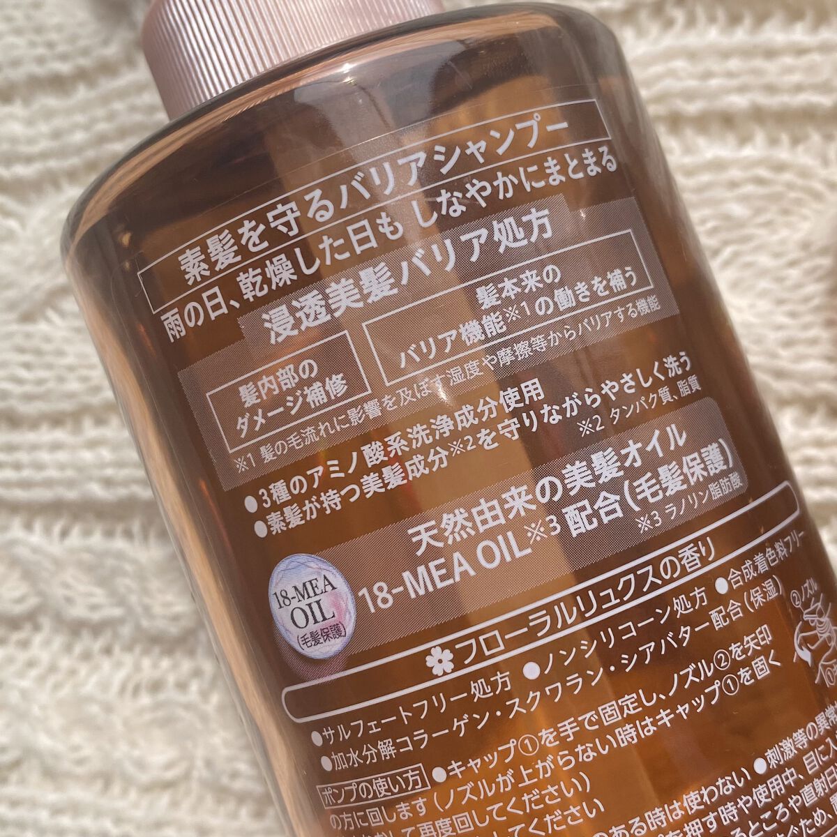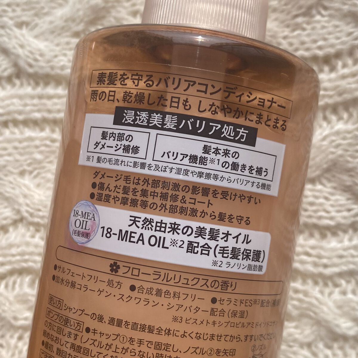 - うる髪続くバリアシャンプー・コンディショナー 雨の日、乾燥した日も しなやかにまとまる 【バリアシャンプー・コンディショナー共通】 ●浸透美髪バリア処方 ・髪内部のダメージ補修 ・ 髪本来のバリア機能*の働きを補う *髪の毛流れに変化を及ぼす湿度・摩擦等からバリアする機能 ●天然由来の美髪オイル 18-MEA OIL*配合(毛髪保護)*ラノリン脂肪酸 ●サルフェートフリー処方 ●合成着色料フリー ●加水分解コラーゲン・スクワラン・シアバター配合(保湿) ✿フローラルリュクスの香り 【バリアシャンプー】 ●3種のアミノ酸系洗浄成分使用 ●とろふわスフレ泡で素髪が持つ美髪成分*を守りながらやさしく洗う *タンパク質、脂質 ●ノンシリコーン処方 【バリアコンディショナー】 ●傷んだ髪を集中補修&コート ●湿度や摩擦等の外部刺激から髪を守る ●セラミドES*配合(補修)*ビスメトキシプロプルアミドイソドコサン