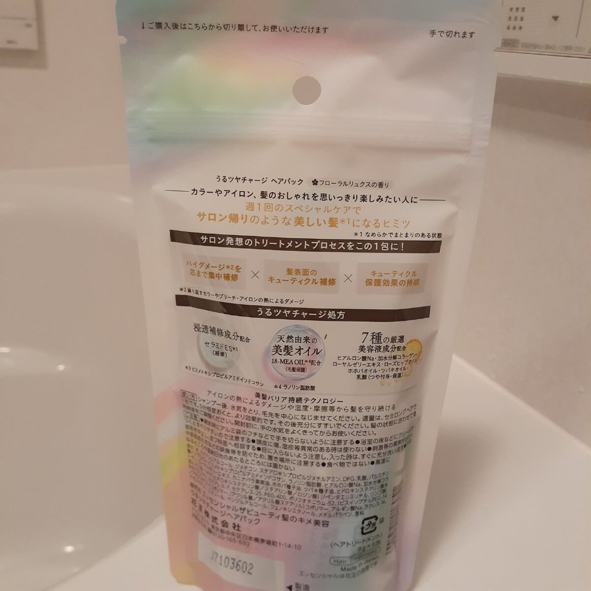 - ○カラーやアイロン、髪のおしゃれを思いっきり楽しみたい人に ○週1回のスペシャルケアで、サロン帰りのような美しい髪*へ(*なめらかでまとまりのある状態) 〇サロン発想のトリートメントプロセスがこの1包に! ○サロンのトリートメントプロセス ・ハイダメージ*を芯まで集中補修。(*繰り返すカラーやブリーチ・アイロンの熱によるダメージ) ・髪表面のキューティクルを補修 ・キューティクルの保護効果の持続 〇うるツヤチャージ処方 ・浸透補修成分配合:セラミドES*(補修)(*ビスメトキシプロピルアミドイソドコサン) ・天然由来の美髪オイル18-MEA OIL*配合(毛髪保護)(*ラノリン脂肪酸) ・7種の厳選美容液成分配合:ヒアルロン酸Na・加水分解コラーゲン・ローヤルゼリーエキス・ローズヒップオイル・ホホバホイル・ツバキオイル・乳酸(つや付与・保湿) 〇アイロン熱による髪ダメージや温度・摩擦等から髪を守り続ける”美髪バリア持続テクノロジー” 〇フローラルリュクスの香り