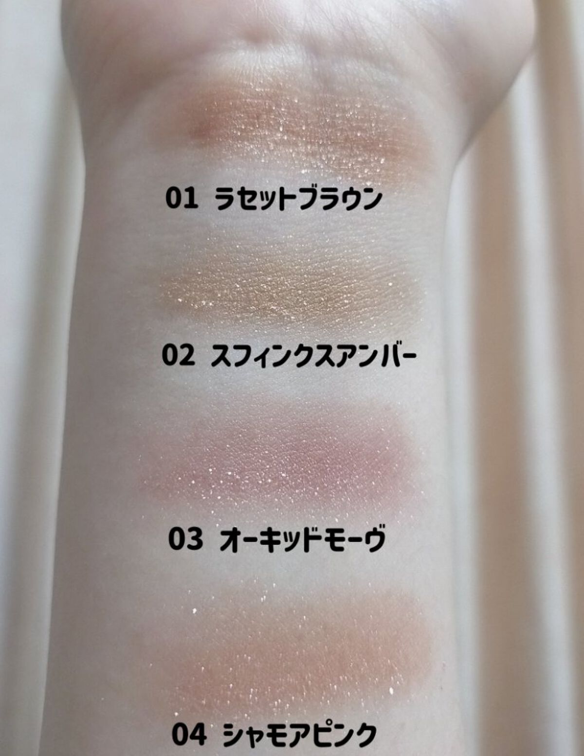 - <01 ラセットブラウン> タルク、ホホバ種子油、リンゴ酸ジイソステアリル、ジメチコン、ワセリン、(HDI/トリメチロールヘキシルラクトン)クロスポリマー、1,2-ヘキサンジオール、メタクリル酸メチルクロスポリマー、シリカ、イソステアリン酸ソルビタン、トコフェロール、スクワラン、セラミドNP、水、ヒアルロン酸Na、メチルパラベン、BG、フェノキシエタノール、水溶性コラーゲン、エチルパラベン、マイカ、酸化鉄、合成フルオロフロゴパイト、ホウケイ酸(Ca/Al)、酸化チタン、酸化スズ <02 スフィンクスアンバー> タルク、ホホバ種子油、リンゴ酸ジイソステアリル、ジメチコン、ワセリン、(HDI/トリメチロールヘキシルラクトン)クロスポリマー、シリカ、1,2-ヘキサンジオール、メタクリル酸メチルクロスポリマー、イソステアリン酸ソルビタン、トコフェロール、スクワラン、セラミドNP、水、ヒアルロン酸Na、メチルパラベン、BG、フェノキシエタノール、水溶性コラーゲン、エチルパラベン、マイカ、ホウケイ酸(Ca/Al)、酸化鉄、合成フルオロフロゴパイト、酸化チタン、酸化スズ <03 オーキッドモーヴ> タルク、ホホバ種子油、リンゴ酸ジイソステアリル、ジメチコン、ワセリン、(HDI/トリメチロールヘキシルラクトン)クロスポリマー、1,2-ヘキサンジオール、メタクリル酸メチルクロスポリマー、シリカ、イソステアリン酸ソルビタン、トコフェロール、スクワラン、セラミドNP、水、ヒアルロン酸Na、メチルパラベン、BG、フェノキシエタノール、水溶性コラーゲン、エチルパラベン、合成フルオロフロゴパイト、ホウケイ酸(Ca/Al)、酸化鉄、グンジョウ、マイカ、酸化チタン、アルミナ、水酸化Al、赤226、酸化スズ <04 シャモアピンク> タルク、ホホバ種子油、リンゴ酸ジイソステアリル、ジメチコン、ワセリン、(HDI/トリメチロールヘキシルラクトン)クロスポリマー、1,2-ヘキサンジオール、メタクリル酸メチルクロスポリマー、シリカ、イソステアリン酸ソルビタン、トコフェロール、スクワラン、セラミドNP、水、ヒアルロン酸Na、メチルパラベン、BG、フェノキシエタノール、水溶性コラーゲン、エチルパラベン、マイカ、合成フルオロフロゴパイト、ホウケイ酸(Ca/Al)、酸化鉄、酸化チタン、酸化スズ