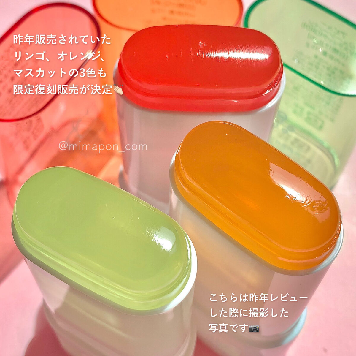- <RD01 リンゴバー> ジ(カプリル/カプリン酸)BG、カプリル酸プロピルヘプチル、オクチルドデカノール、アジピン酸ジブチル、安息香酸フェネチル、ジブチルラウロイルグルタミド、ジフェニルシロキシフェニルトリメチコン、ジブチルエチルヘキサノイルグルタミド、ジエチルアミノヒドロキシベンゾイル安息香酸ヘキシル、ビスエチルヘキシルオキシフェノールメトキシフェニルトリアジン、安息香酸アルキル(C12-15)、エチルヘキシルトリアゾン、ダイマージリノール酸(フィトステリル/イソステアリル/セチル/ステアリル/ベヘニル)、ポリシリコーン-15、トリメリト酸トリトリデシル、パルミチン酸デキストリン、ナイアシンアミド、酢酸ジステアリン酸スクロース、トコフェロール、トリイソステアリン酸ポリグリセリル-2、ジイソステアリン酸ポリグリセリル-2、リンゴ種子油、香料、赤104(1) <OR01 オレンジバー> ジ(カプリル/カプリン酸)BG、カプリル酸プロピルヘプチル、オクチルドデカノール、アジピン酸ジブチル、安息香酸フェネチル、ジブチルラウロイルグルタミド、ジフェニルシロキシフェニルトリメチコン、ジブチルエチルヘキサノイルグルタミド、ジエチルアミノヒドロキシベンゾイル安息香酸ヘキシル、ビスエチルヘキシルオキシフェノールメトキシフェニルトリアジン、安息香酸アルキル(C12-15)、エチルヘキシルトリアゾン、ダイマージリノール酸(フィトステリル/イソステアリル/セチル/ステアリル/ベヘニル)、ポリシリコーン-15、トリメリト酸トリトリデシル、パルミチン酸デキストリン、ナイアシンアミド、酢酸ジステアリン酸スクロース、トコフェロール、トリイソステアリン酸ポリグリセリル-2、トリ(カプリル酸/カプリン酸)グリセリル、ヒポファエラムノイデス果実油、香料、黄5 <GR01 マスカットバー> ジ(カプリル/カプリン酸)BG、カプリル酸プロピルヘプチル、オクチルドデカノール、アジピン酸ジブチル、安息香酸フェネチル、ジブチルラウロイルグルタミド、ジフェニルシロキシフェニルトリメチコン、ジブチルエチルヘキサノイルグルタミド、ジエチルアミノヒドロキシベンゾイル安息香酸ヘキシル、ビスエチルヘキシルオキシフェノールメトキシフェニルトリアジン、安息香酸アルキル(C12-15)、エチルヘキシルトリアゾン、ダイマージリノール酸(フィトステリル/イソステアリル/セチル/ステアリル/ベヘニル)、ポリシリコーン-15、トリメリト酸トリトリデシル、パルミチン酸デキストリン、ナイアシンアミド、酢酸ジステアリン酸スクロース、トコフェロール、トリイソステアリン酸ポリグリセリル-2、ブドウ種子油、香料、青1 <パインアメ(限定)> ジ(カプリル/カプリン酸)BG、カプリル酸プロピルヘプチル、オクチルドデジ(カプリル/カプリン酸)BG、オクチルドデカノール、アジピン酸ジブチル、安息香酸フェネチル、ジブチルラウロイルグルタミド、ジフェニルシロキシフェニルトリメチコン、ジブチルエチルヘキサノイルグルタミド、ジエチルアミノヒドロキシベンゾイル安息香酸ヘキシル、ビスエチルヘキシルオキシフェノールメトキシフェニルトリアジン、安息香酸アルキル(C12-15)、エチルヘキシルトリアゾン、ダイマージリノール酸(フィトステリル/イソステアリル/セチル/ステアリル/ベヘニル)、ポリシリコーン-15、トリメリト酸トリトリデシル、パルミチン酸デキストリン、トリ酢酸テトラステアリン酸スクロース、トコフェロール、テトラヘキシルデカン酸アスコルビル、ナイアシンアミド、香料