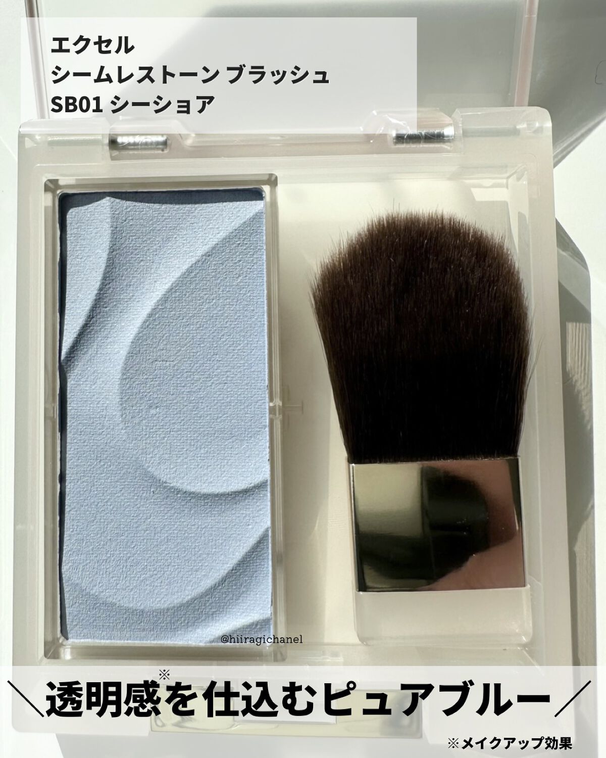 ニュアンスチェンジのブルーチーク🩵◆excel▫︎シームレストーンブラッシュ▫︎SB01シーショア▫︎¥1,650※香りなしチークに青みをプラスしたい方、頬に赤みが出やすい方におすすめしたい…!粒子の細かい粉質でしっとりめ、密着してくれる感じ...