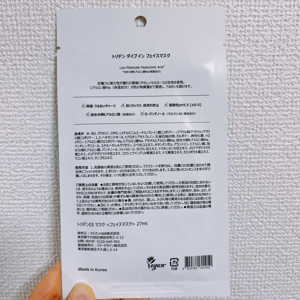 - <1枚> 水、BG、グリセリン、DPG、(メチルビニルエーテル/マレイン酸)コポリマー、(アクリル酸グリセリル/アクリル酸)コポリマー、1,2-ヘキサンジオール、ヒドロキシアセトフェノン、孔雀石抽出物、カルボマー、異性化糖、トロメタミン、ヒアルロン酸クロスポリマーNa、ヒアルロン酸Na、アセチルヒアルロン酸Na、加水分解ヒアルロン酸Na、ペンチレングリコール、エチルヘキシルグリセリン、スベリヒユエキス、キサンタンガム、アラントイン、ヒアルロン酸、加水分解ヒアルロン酸、パンテノール、トレハロース、カミツレ花エキス、トウキンセンカ花エキス、メリアアザジラクタ葉エキス、メリアアザジラクタ花エキス、コクシニアインディカ果実エキス、ナス果実エキス、カミメボウキ葉エキス、ウコン根エキス、サンゴモエキス <3枚> 水、BG、グリセリン、DPG、(メチルビニルエーテル/マレイン酸)コポリマー、(アクリル酸グリセリル/アクリル酸)コポリマー、1,2-ヘキサンジオール、ヒドロキシアセトフェノン、乳雀石抽出物、カルボマー、異性化糖、トロメタミン、ヒアルロン酸クロスポリマーNa、ヒアルロン酸Na、アセチルヒアルロン酸Na、加水分解ヒアルロン酸Na、ペンチレングリコール、エチルヘキシルグリセリン、スベリヒユエキス、キサンタンガム、アラントイン、ヒアルロン酸、加水分解ヒアルロン酸、パンテノール、トレハロース、カミツレ花エキス、トウキンセンカ花エキス、メリアアザジラクタ葉エキス、メリアアザジラクタ花エキス、コクシニアインディカ果実エキス、ナス果実エキス、カミメボウキ葉エキス、ウコン根エキス、サンゴモエキス <10枚> 水、BG、グリセリン、DPG、(メチルビニルエーテル/マレイン酸)コポリマー、(アクリル酸グリセリル/アクリル酸)コポリマー、1,2-ヘキサンジオール、ヒドロキシアセトフェノン、孔雀石抽出物、カルボマー、異性化糖、トロメタミン、ヒアルロン酸クロスポリマーNa、ヒアルロン酸Na、アセチルヒアルロン酸Na、加水分解ヒアルロン酸Na、ペンチレングリコール、エチルヘキシルグリセリン、スベリヒユエキス、キサンタンガム、アラントイン、ヒアルロン酸、加水分解ヒアルロン酸、パンテノール、トレハロース、カミツレ花エキス、トウキンセンカ花エキス、メリアアザジラクタ葉エキス、メリアアザジラクタ花エキス、コクシニアインディカ果実エキス、ナス果実エキス、カミメボウキ葉エキス、ウコン根エキス、サンゴモエキス