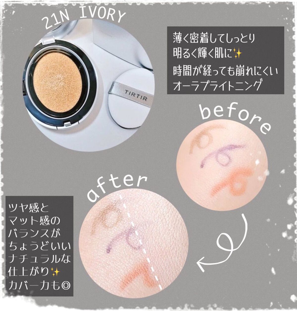 肌の中から密着して積み重ねる72時間持続オーラ光彩クッション肌の上で息をつくようなスキンフィットレイヤーでしっとりとした濃密なカバー 薄付きなのにカバー力高くて好き TIRTIRのクッションファンデ、どれも好きすぎる 厚塗り感がないし、素肌感出したい人やナチュラルメイク好きな人に良さそう