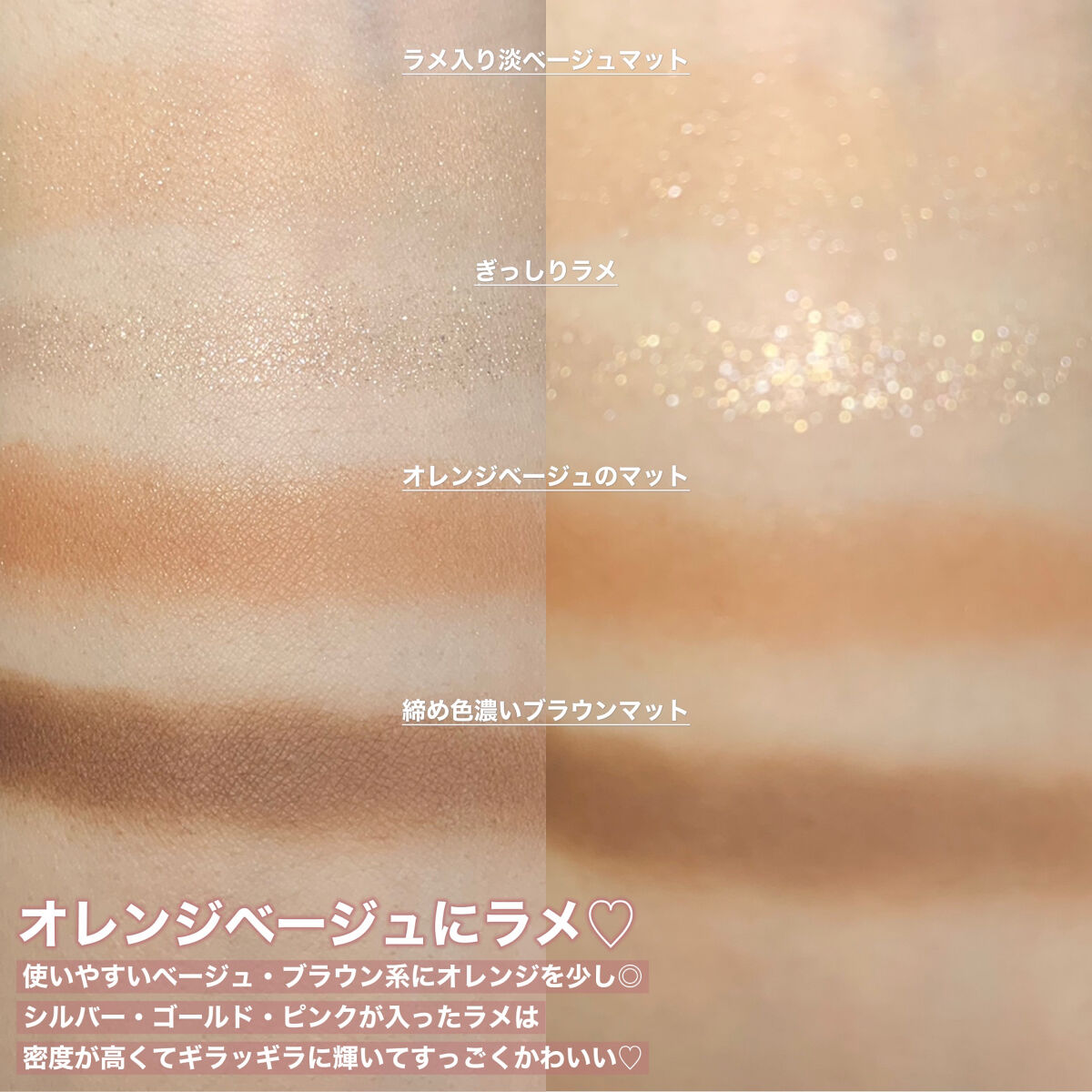 めっちゃくちゃ進化してるーーー😳😳😳 ブラシでも指でも取った瞬間の柔らかさが桁違いに良くなってる!!! ふわっとブレンドしやすくてボカしやすい!!! 05トフィーナッツラテはデイリー使いしやすい ナチュラル発色でかなり自然な仕上がり🥜 今っぽい色味で盛らずに陰影で盛る感じです💗 明度にしっかり差があって陰影をつけやすい◎ 06バニラティーラテはほろ苦ピンクメイクに🎀 05と比較するとかなり強い発色で スモーキーメイクに合いそうなパレット! パレット左から2番目のホワイトラメが ほんとに可愛くて透けるように光る感じ💎