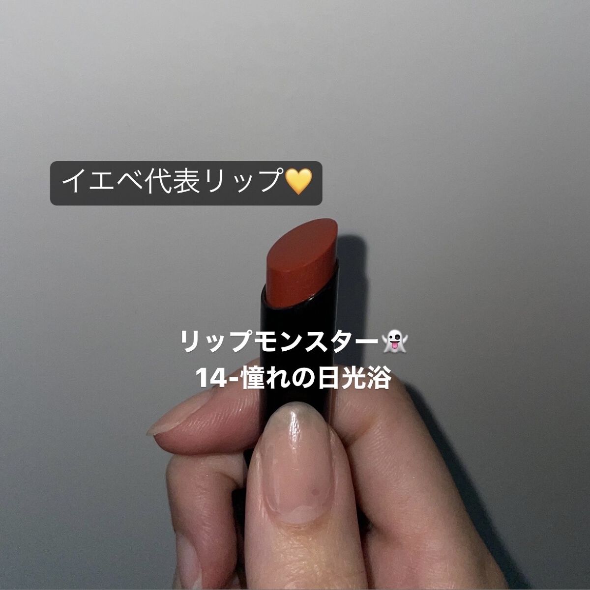 赤の強いオレンジって感じで色が目立つのでこのリップに合わせてメイクすることが多いかも👀 唇だけ変に浮くことはなくて派手だけどかわいい! ティッシュオフしても結構濃く残るからすごく助かる❤️🔥 私がリップモンスターを使う時は2色組みあわせたりすることもあるんだけど、これを使う時はEX1の焦がした茶葉の余韻を上から少し塗っても大人っぽくなって可愛かったです🫶
