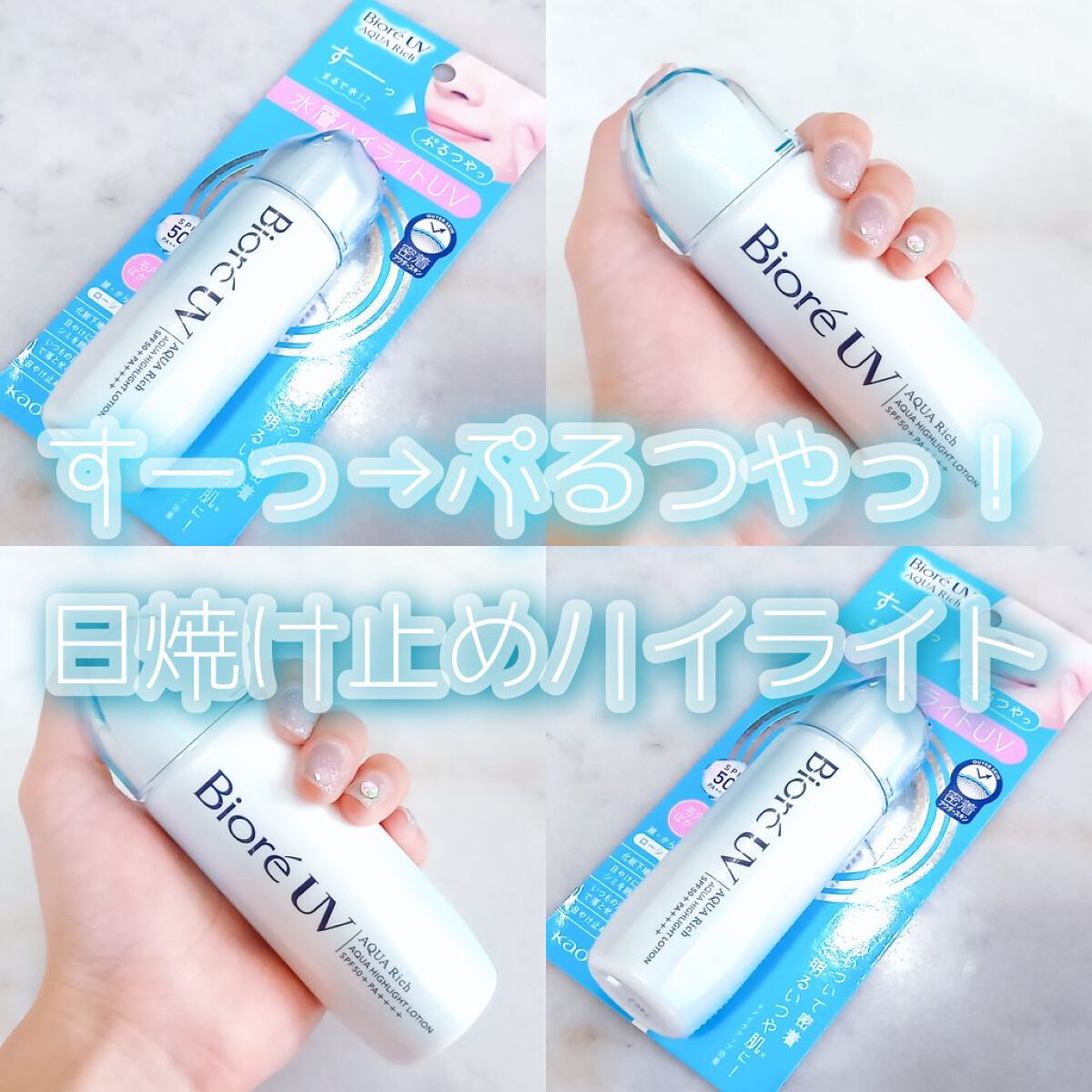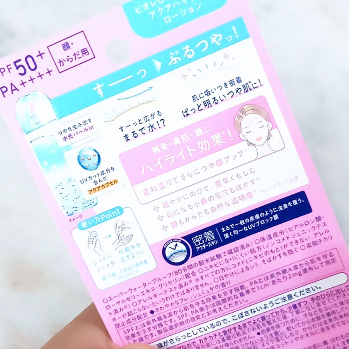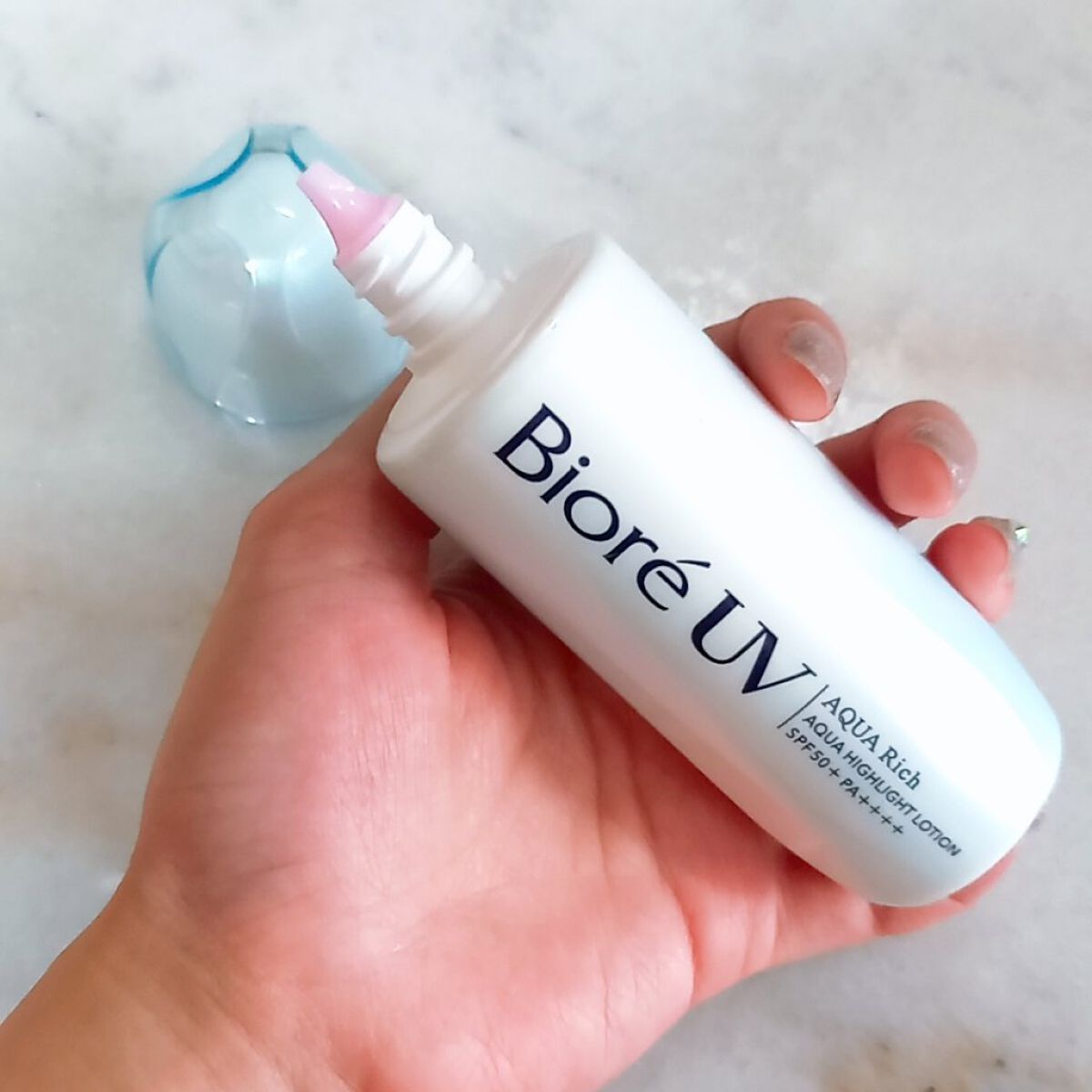 .ビオレUVアクアリッチアクアハイライトローション🌸#水層ハイライトuv身体用に購入🙌シャバシャバ系の日焼け止め。ジェルタイプに慣れてた私としてはやや使いづらい笑でも微粒のパールがすごくて、ほんとにキラキラつや感がアップ。頰、鼻筋やひたいに使...