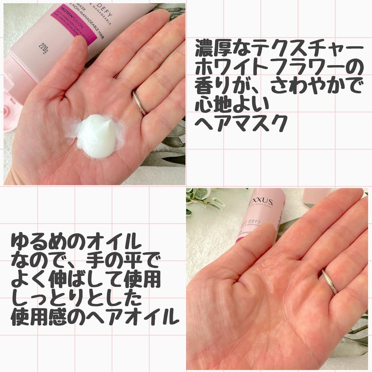 ドライヤーの熱を味方に、ダメージ補修 ☑️ホワイトフラワーのさわやかな香り 軽めのオイルで広がりやすい私の髪をまとめてくれました。香りも良かったです。 毛髪科学×サロン発祥 ☑️うねり*1をケアし、毛先までまとまる髪へ