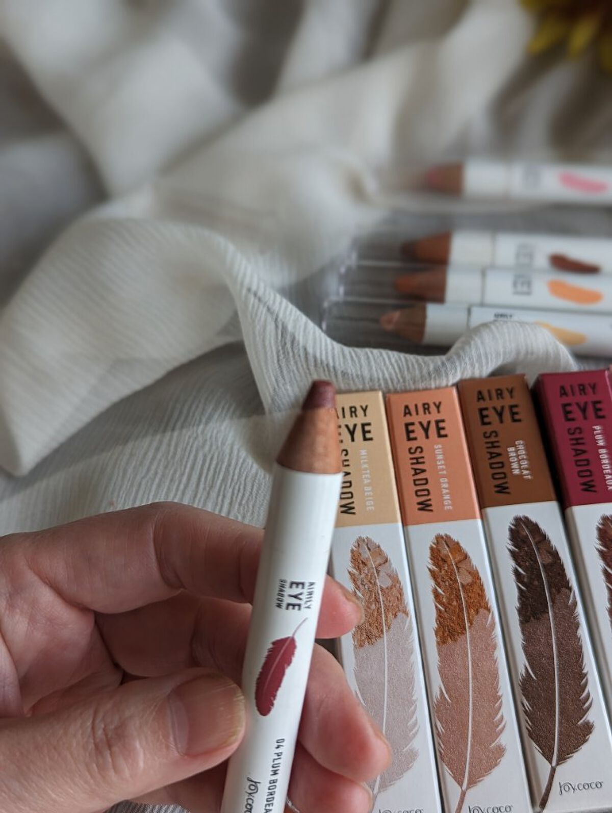 JOYCOCOAiryEYEShadowエアリーアイシャドウ01ミルクティーベージュ04プラムボルドーペンシルなのにお肌にのせるとパウダーみたいに🙌🏻描きやすくて、発色も◎ラメもお上品で可愛い🫶気になった方はチェックしてみてね*ᕷ˖°#エアリ...