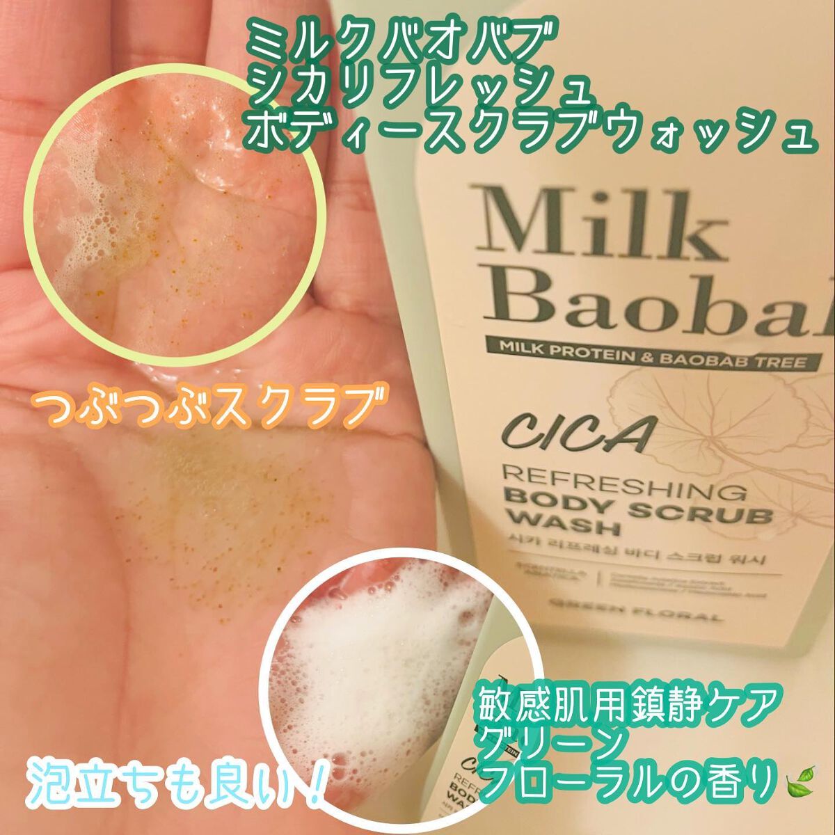 ミルクバオバブ(@milkbaobab_japan)様からお贈りいただきました☻【CICAスクラブウォッシュ】爽やかなグリーンフローラルの香りのするボディウォッシュ!パッケージの形もどこか牛乳みたいでかわいい🐮笑ウォッシュなので毎日使えるのが...