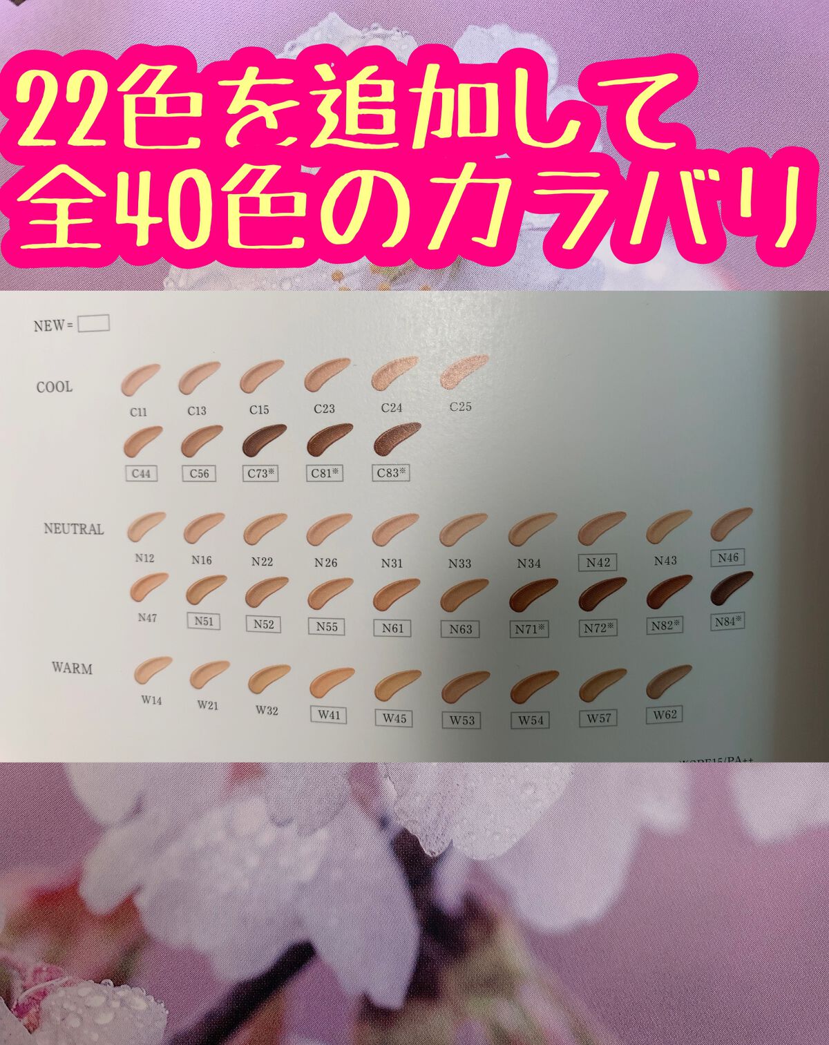 - <C11> 水、シクロメチコン、タルク、ジメチコン、エタノール、トリフルオロアルキルジメチルトリメチルシロキシケイ酸、メトキシケイヒ酸エチルヘキシル、イソノナン酸イソトリデシル、安息香酸アルキル(C12-15)、ビス(PEG/PPG-14/14)ジメチコン、シリカ、アストロカリウムムルムル種子脂、シロキクラゲエキス、ゼニアオイエキス、ダマスクバラ花エキス、テトラヘキシルデカン酸アスコルビル、トコフェロール、ヒアルロン酸Na、マツリカ花エキス、レモン果実エキス、BG、BHT、PEG-9ポリジメチルシロキシエチルジメチコン、(アクリレーツ/アクリル酸エチルヘキシル/メタクリル酸ジメチコン)コポリマー、(チタン/酸化チタン)焼結物、(フッ化/水酸化/酸化)/(Mg/K/ケイ素)、キサンタンガム、ジステアルジモニウムヘクトライト、ジフェニルシロキシフェニルトリメチコン、スクワラン、ステアリン酸、トリエトキシカプリリルシラン、ラウロイルリシン、レシチン、塩化Na、含水シリカ、合成フルオロフロゴパイト、酸化スズ、酸化ポリエチレン、水酸化Al、水添ポリイソブテン、麻セルロース、フェノキシエタノール、香料、酸化チタン、酸化亜鉛、酸化鉄 <C13> 水、シクロメチコン、タルク、ジメチコン、エタノール、トリフルオロアルキルジメチルトリメチルシロキシケイ酸、メトキシケイヒ酸エチルヘキシル、イソノナン酸イソトリデシル、安息香酸アルキル(C12-15)、ビス(PEG/PPG-14/14)ジメチコン、シリカ、アストロカリウムムルムル種子脂、シロキクラゲエキス、ゼニアオイエキス、ダマスクバラ花エキス、テトラヘキシルデカン酸アスコルビル、トコフェロール、ヒアルロン酸Na、マツリカ花エキス、レモン果実エキス、BG、BHT、PEG-9ポリジメチルシロキシエチルジメチコン、(アクリレーツ/アクリル酸エチルヘキシル/メタクリル酸ジメチコン)コポリマー、(チタン/酸化チタン)焼結物、(フッ化/水酸化/酸化)/(Mg/K/ケイ素)、キサンタンガム、ジステアルジモニウムヘクトライト、ジフェニルシロキシフェニルトリメチコン、スクワラン、ステアリン酸、トリエトキシカプリリルシラン、ラウロイルリシン、レシチン、塩化Na、含水シリカ、合成フルオロフロゴパイト、酸化スズ、酸化ポリエチレン、水酸化Al、水添ポリイソブテン、麻セルロース、フェノキシエタノール、香料、酸化チタン、酸化亜鉛、酸化鉄 <C15> 水、シクロメチコン、タルク、ジメチコン、エタノール、トリフルオロアルキルジメチルトリメチルシロキシケイ酸、メトキシケイヒ酸エチルヘキシル、イソノナン酸イソトリデシル、安息香酸アルキル(C12-15)、ビス(PEG/PPG-14/14)ジメチコン、シリカ、アストロカリウムムルムル種子脂、シロキクラゲエキス、ゼニアオイエキス、ダマスクバラ花エキス、テトラヘキシルデカン酸アスコルビル、トコフェロール、ヒアルロン酸Na、マツリカ花エキス、レモン果実エキス、BG、BHT、PEG-9ポリジメチルシロキシエチルジメチコン、(アクリレーツ/アクリル酸エチルヘキシル/メタクリル酸ジメチコン)コポリマー、(チタン/酸化チタン)焼結物、(フッ化/水酸化/酸化)/(Mg/K/ケイ素)、キサンタンガム、ジステアルジモニウムヘクトライト、ジフェニルシロキシフェニルトリメチコン、スクワラン、ステアリン酸、トリエトキシカプリリルシラン、ラウロイルリシン、レシチン、塩化Na、含水シリカ、合成フルオロフロゴパイト、酸化スズ、酸化ポリエチレン、水酸化Al、水添ポリイソブテン、麻セルロース、フェノキシエタノール、香料、酸化チタン、酸化亜鉛、酸化鉄 <C23> 水、シクロメチコン、タルク、ジメチコン、エタノール、トリフルオロアルキルジメチルトリメチルシロキシケイ酸、メトキシケイヒ酸エチルヘキシル、イソノナン酸イソトリデシル、安息香酸アルキル(C12-15)、ビス(PEG/PPG-14/14)ジメチコン、シリカ、アストロカリウムムルムル種子脂、シロキクラゲエキス、ゼニアオイエキス、ダマスクバラ花エキス、テトラヘキシルデカン酸アスコルビル、トコフェロール、ヒアルロン酸Na、マツリカ花エキス、レモン果実エキス、BG、BHT、PEG-9ポリジメチルシロキシエチルジメチコン、(アクリレーツ/アクリル酸エチルヘキシル/メタクリル酸ジメチコン)コポリマー、(チタン/酸化チタン)焼結物、(フッ化/水酸化/酸化)/(Mg/K/ケイ素)、キサンタンガム、ジステアルジモニウムヘクトライト、ジフェニルシロキシフェニルトリメチコン、スクワラン、ステアリン酸、トリエトキシカプリリルシラン、ラウロイルリシン、レシチン、塩化Na、含水シリカ、合成フルオロフロゴパイト、酸化スズ、酸化ポリエチレン、水酸化Al、水添ポリイソブテン、麻セルロース、フェノキシエタノール、香料、酸化チタン、酸化亜鉛、酸化鉄 <C24> 水、シクロメチコン、タルク、ジメチコン、エタノール、トリフルオロアルキルジメチルトリメチルシロキシケイ酸、メトキシケイヒ酸エチルヘキシル、イソノナン酸イソトリデシル、安息香酸アルキル(C12-15)、ビス(PEG/P