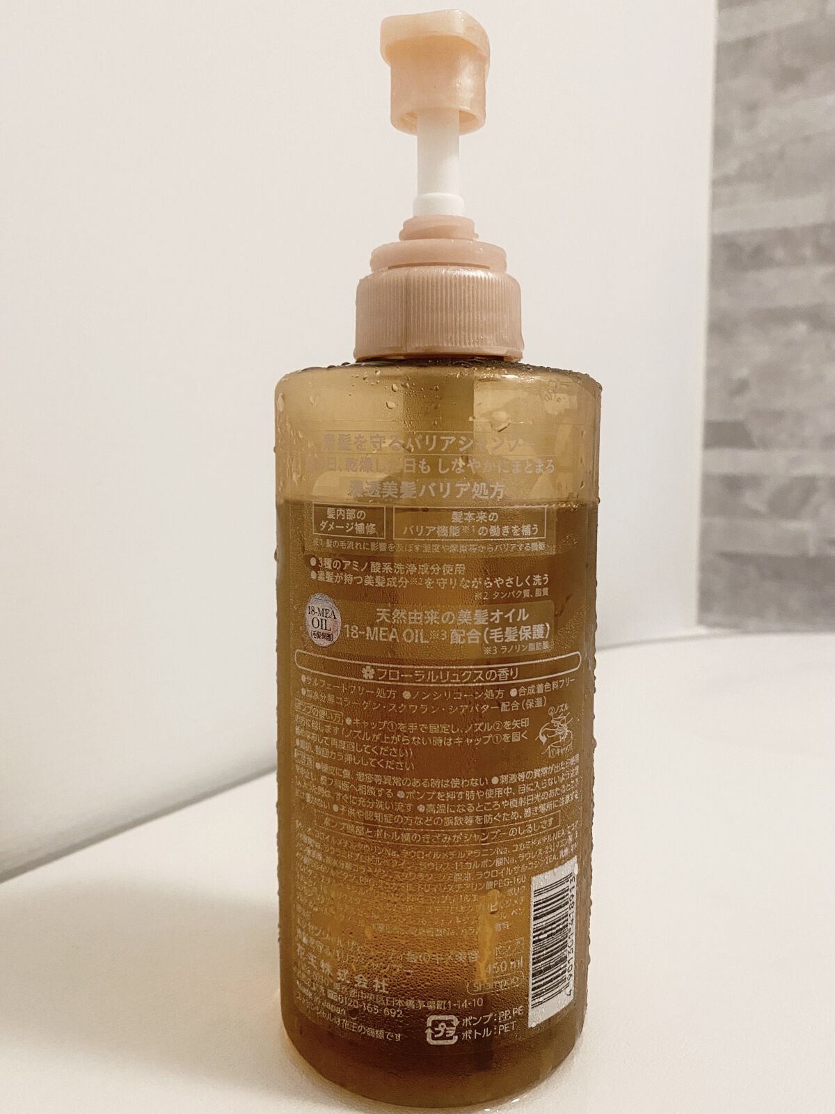 - うる髪続くバリアシャンプー・コンディショナー 雨の日、乾燥した日も しなやかにまとまる 【バリアシャンプー・コンディショナー共通】 ●浸透美髪バリア処方 ・髪内部のダメージ補修 ・ 髪本来のバリア機能*の働きを補う *髪の毛流れに変化を及ぼす湿度・摩擦等からバリアする機能 ●天然由来の美髪オイル 18-MEA OIL*配合(毛髪保護)*ラノリン脂肪酸 ●サルフェートフリー処方 ●合成着色料フリー ●加水分解コラーゲン・スクワラン・シアバター配合(保湿) ✿フローラルリュクスの香り 【バリアシャンプー】 ●3種のアミノ酸系洗浄成分使用 ●とろふわスフレ泡で素髪が持つ美髪成分*を守りながらやさしく洗う *タンパク質、脂質 ●ノンシリコーン処方 【バリアコンディショナー】 ●傷んだ髪を集中補修&コート ●湿度や摩擦等の外部刺激から髪を守る ●セラミドES*配合(補修)*ビスメトキシプロプルアミドイソドコサン