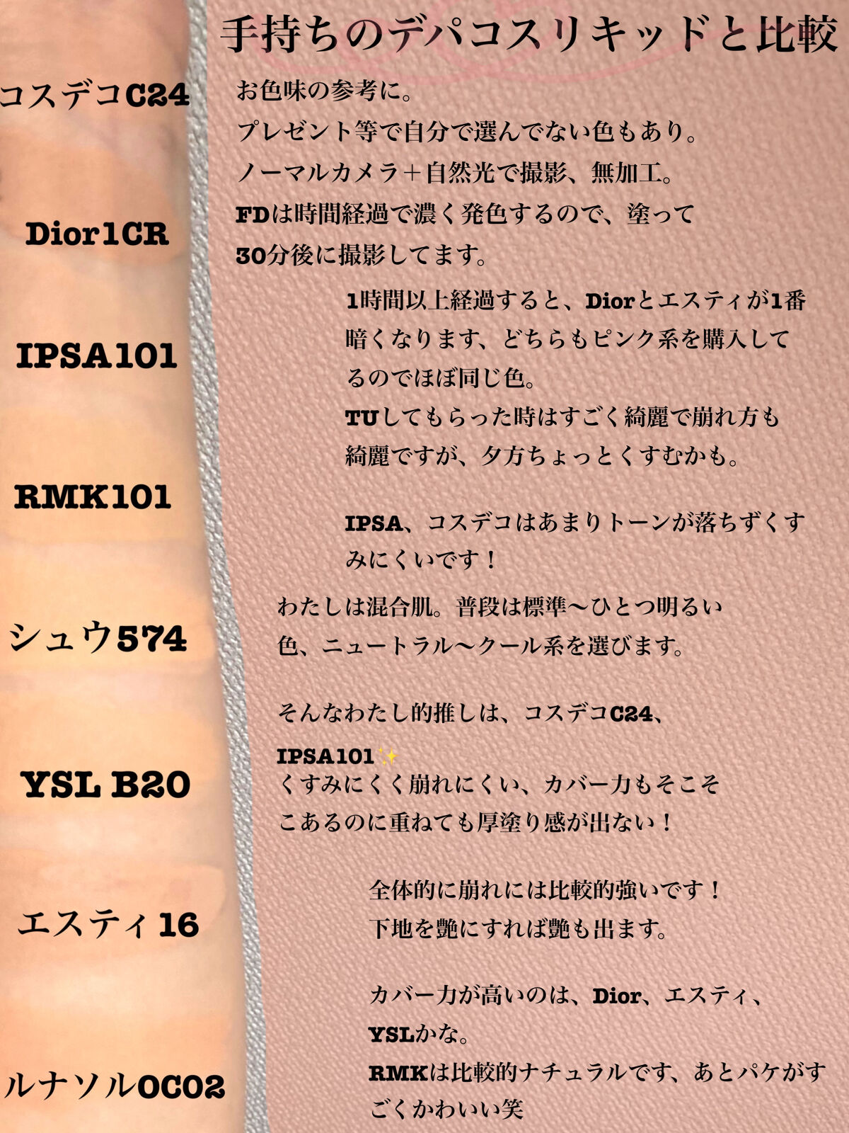 わたしが重視するのはとにかく崩れないこと! お昼まではそんなに崩れないことが絶対条件です! ただその日の肌状態や下地によっても崩れ方が変わってくるのと、色々な下地との組み合わせを試しているとこなので順位はつけられませんが 今回のファンデはどれも優秀だと思ったので紹介します🙌