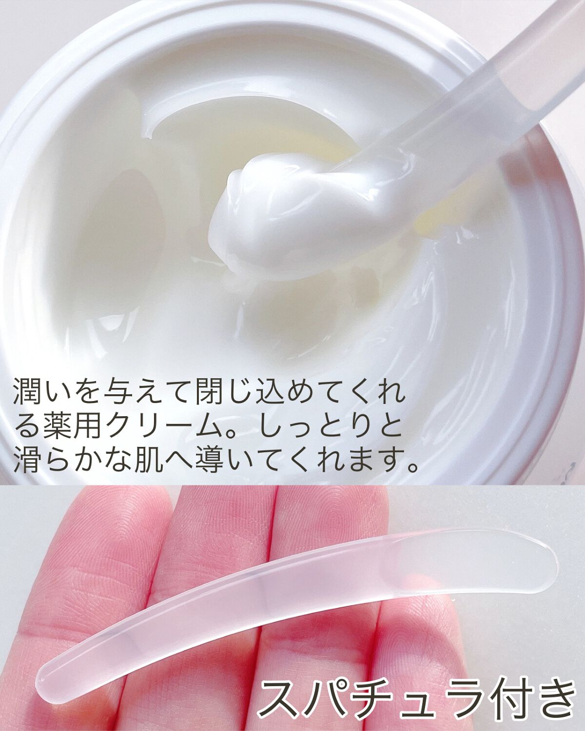 - 【医薬部外品】 薬用肌荒れ予防ケア。 肌荒れ?あわてる前に早めのリペアクリーム。 くり返しがちな肌荒れが気になる方に。 肌荒れ予防ケアとうるおい密封。 たっぷりのうるおいを与え、しっとりなめらかな美肌へ導くクリーム。 角層の深部にうるおいを閉じ込め、肌表面はべたつかず、まるでうるおいの蓋をしたようなしっとり感が続きます。 乾燥による小ジワ*1を目立たなくします。 スパチュラ付き。 ●厳選成分配合、クリーン製法 ●パラベン(防腐剤)フリー、アルコール(エチルアルコール)フリー ●無香料、無着色、弱酸性 ●低刺激設計。敏感肌の方のご協力によるパッチテスト済み*2 ●スティンギングテスト済み*2 ●朝・夜の化粧水の後、スパチュラにパール粒1コ分を目安にとり、顔全体にやさしくなじませます。 (乳液や美容液などをご使用の場合は、お手入れの最後にお使いください。) ●かさつきや乾燥が気になる部分には重ねづけしてください。 ●とくにデリケートな部分にお使いになるときは、肌を強くこすらないよう、軽くおさえるようにしてなじませます。 *1効能評価試験済 *2すべての方にアレルギーや皮ふ刺激がおきないわけではありません
