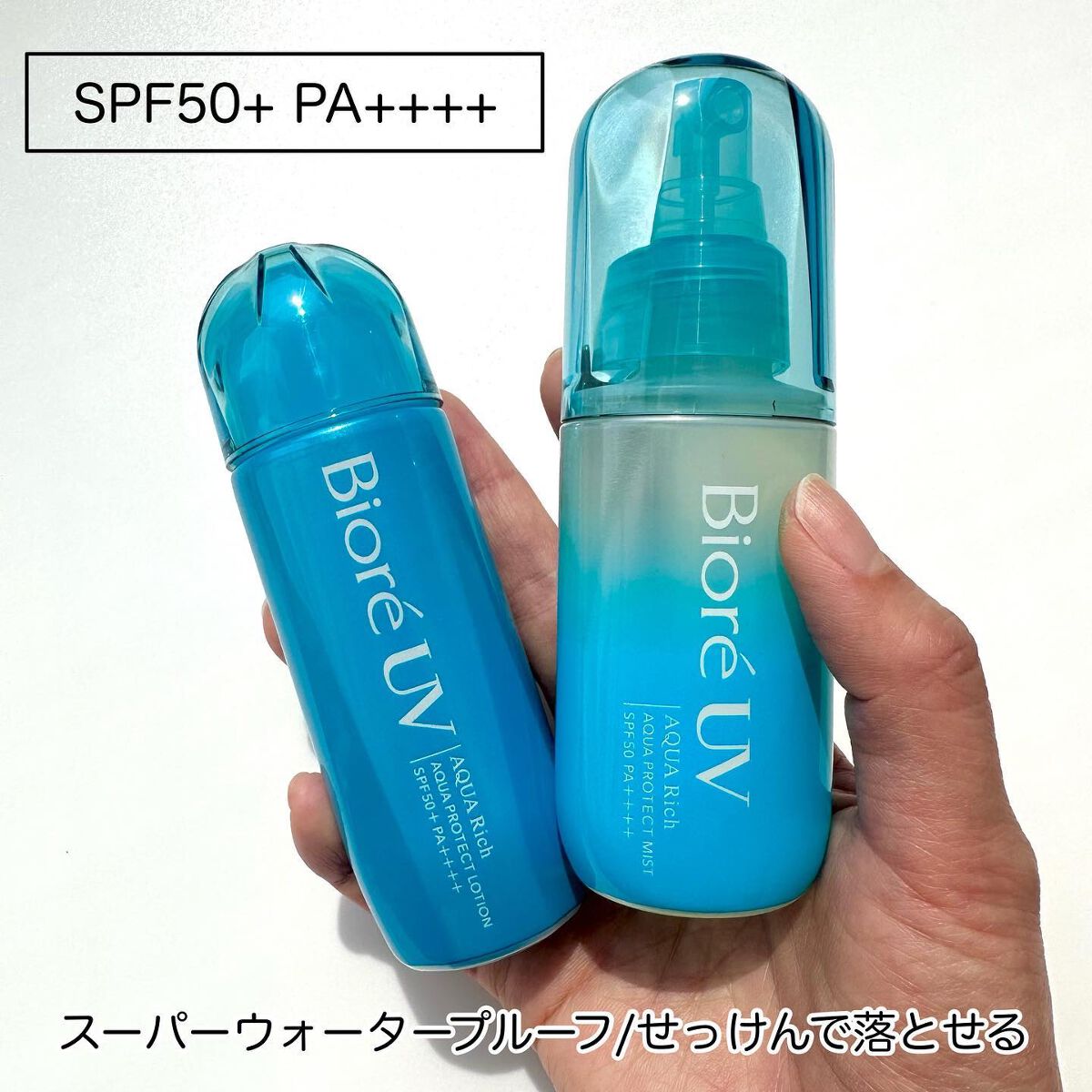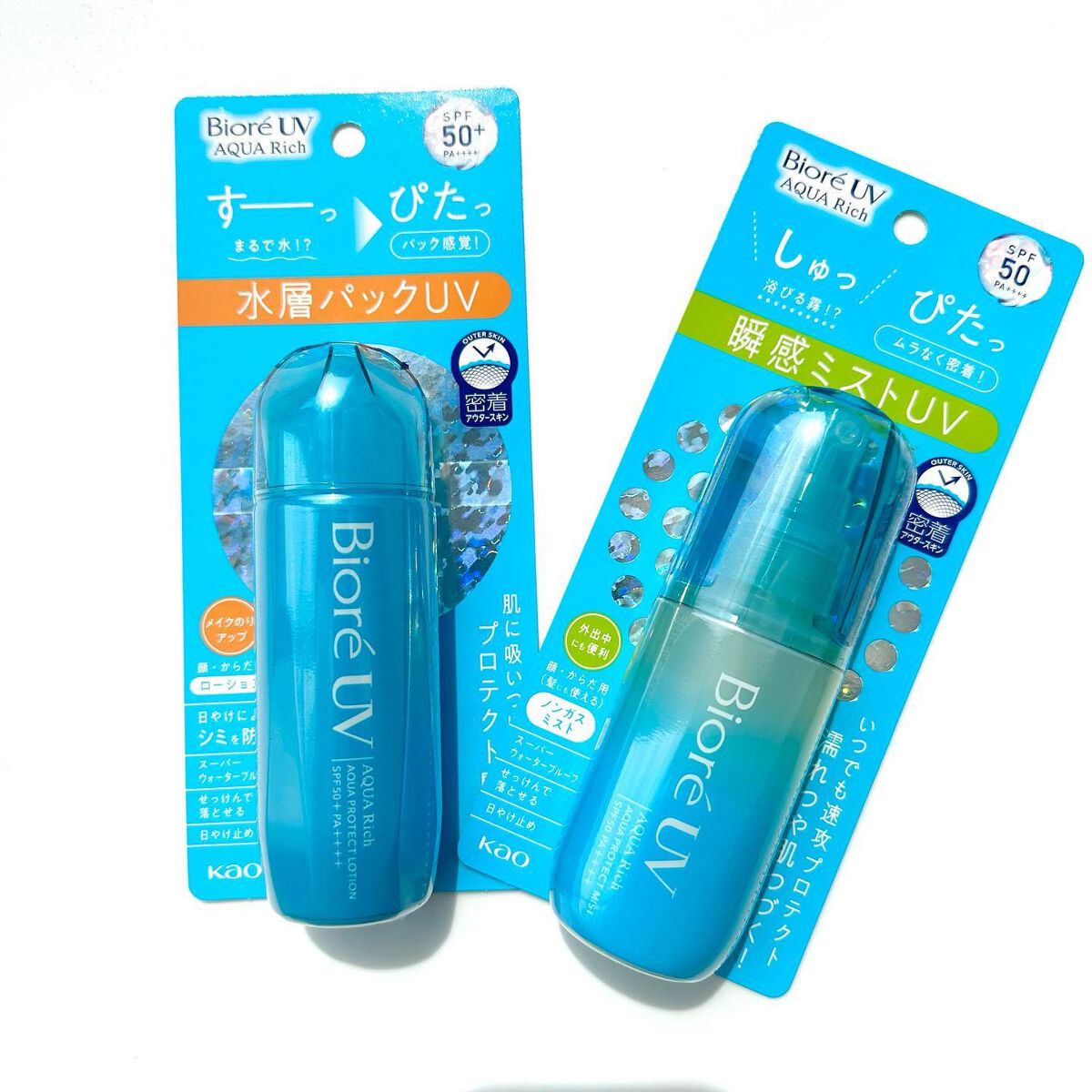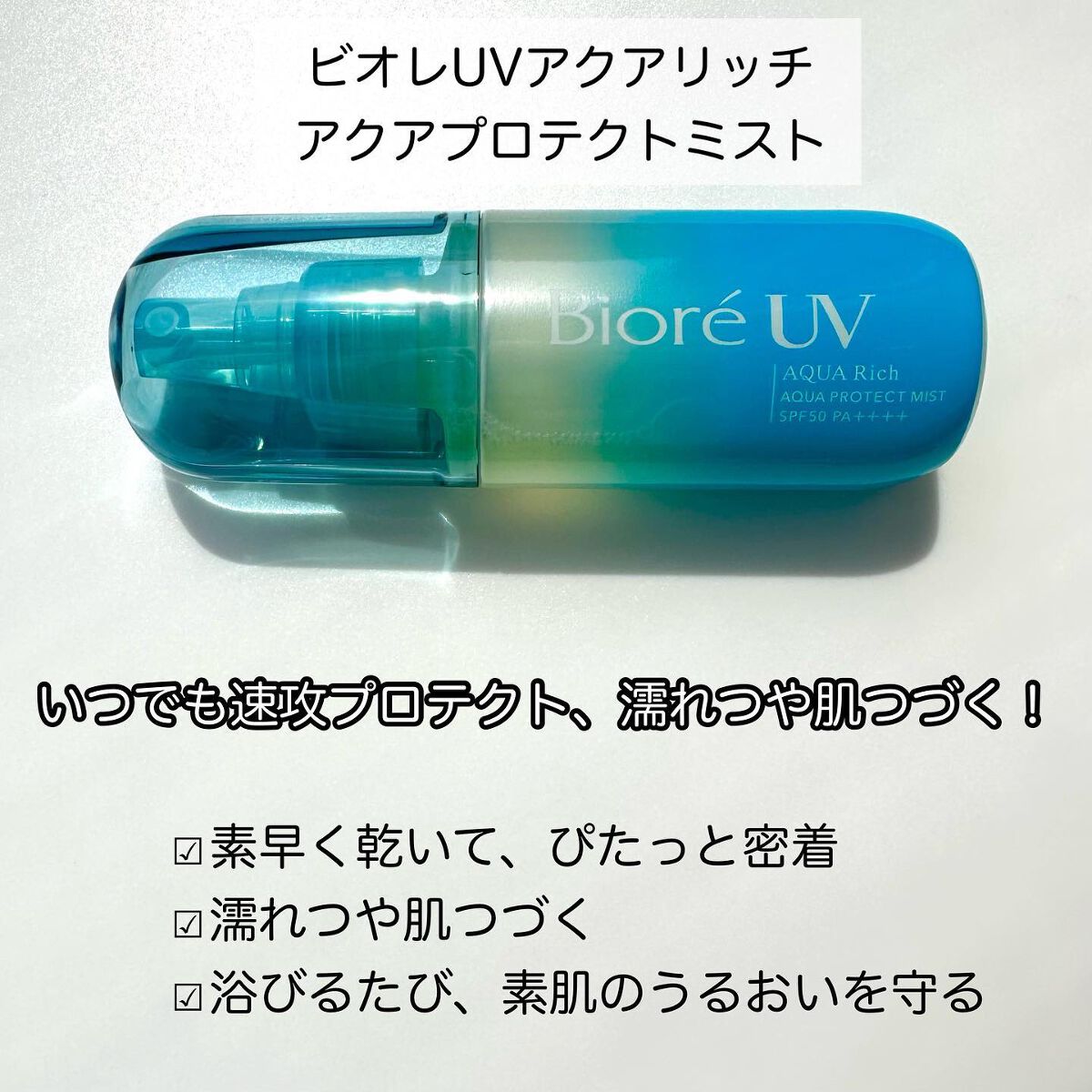 ビオレUVアクアリッチアクアプロテクトミストミストタイプの日焼け止め☀️髪にも使えるし、首や膝裏など塗りにくいところにも使いやすいです♪外出先での塗り直しにも便利!ガスタイプのスプレー缶だと、夏場に暑い中持ち歩くのも怖いし、公共のお手洗いで使...