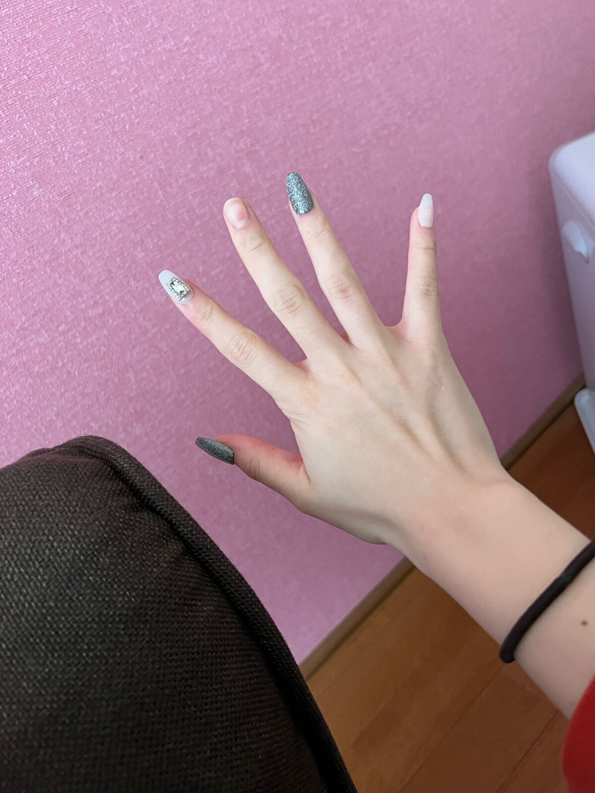 これは、良くも悪くも、ってかんじです。まだお風呂には入っていないのでそこの耐久性はわかりませんが、グルーでつけた後に20秒くらい抑えればだいたいは動かなくなりますww本当に早かったです! こちらはグルーのため厚みがほぼありません。 個人的にはこれが1番嬉しかったです。シールタイプだと、自爪からはみ出した分の粘着グミだったり、自爪とチップの間にひっついたりして髪の毛がさっと通らないことがありましたが、グルータイプは一切(?)そんなこと無かったです。 遠目から見る分には下手くそでもなんの問題もないのでは?と思いましたwwwそこまで難しくはないですが、失敗した時のリカバリーがしづらいです! グルータイプのほうがおすすめです︎👍🏻 ̖́-