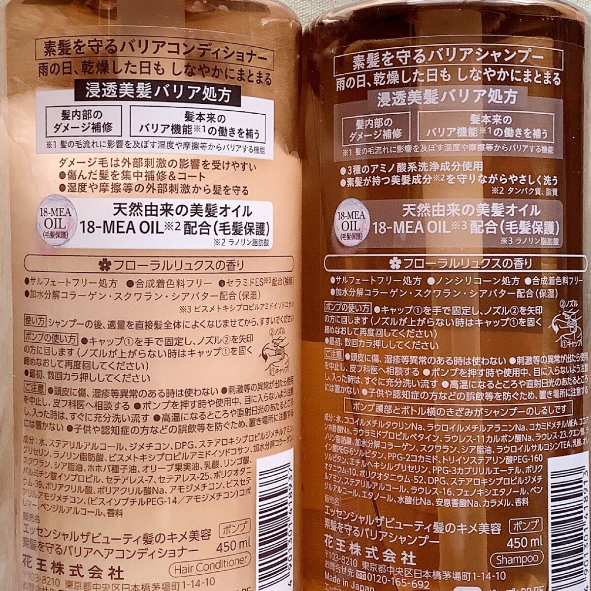 - うる髪続くバリアシャンプー・コンディショナー 雨の日、乾燥した日も しなやかにまとまる 【バリアシャンプー・コンディショナー共通】 ●浸透美髪バリア処方 ・髪内部のダメージ補修 ・ 髪本来のバリア機能*の働きを補う *髪の毛流れに変化を及ぼす湿度・摩擦等からバリアする機能 ●天然由来の美髪オイル 18-MEA OIL*配合(毛髪保護)*ラノリン脂肪酸 ●サルフェートフリー処方 ●合成着色料フリー ●加水分解コラーゲン・スクワラン・シアバター配合(保湿) ✿フローラルリュクスの香り 【バリアシャンプー】 ●3種のアミノ酸系洗浄成分使用 ●とろふわスフレ泡で素髪が持つ美髪成分*を守りながらやさしく洗う *タンパク質、脂質 ●ノンシリコーン処方 【バリアコンディショナー】 ●傷んだ髪を集中補修&コート ●湿度や摩擦等の外部刺激から髪を守る ●セラミドES*配合(補修)*ビスメトキシプロプルアミドイソドコサン
