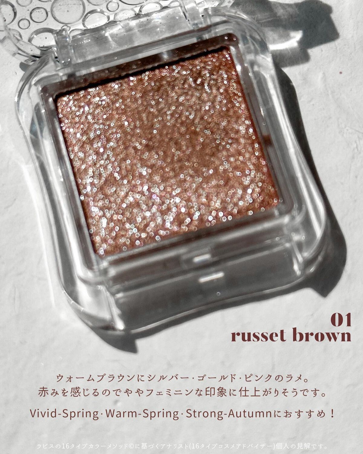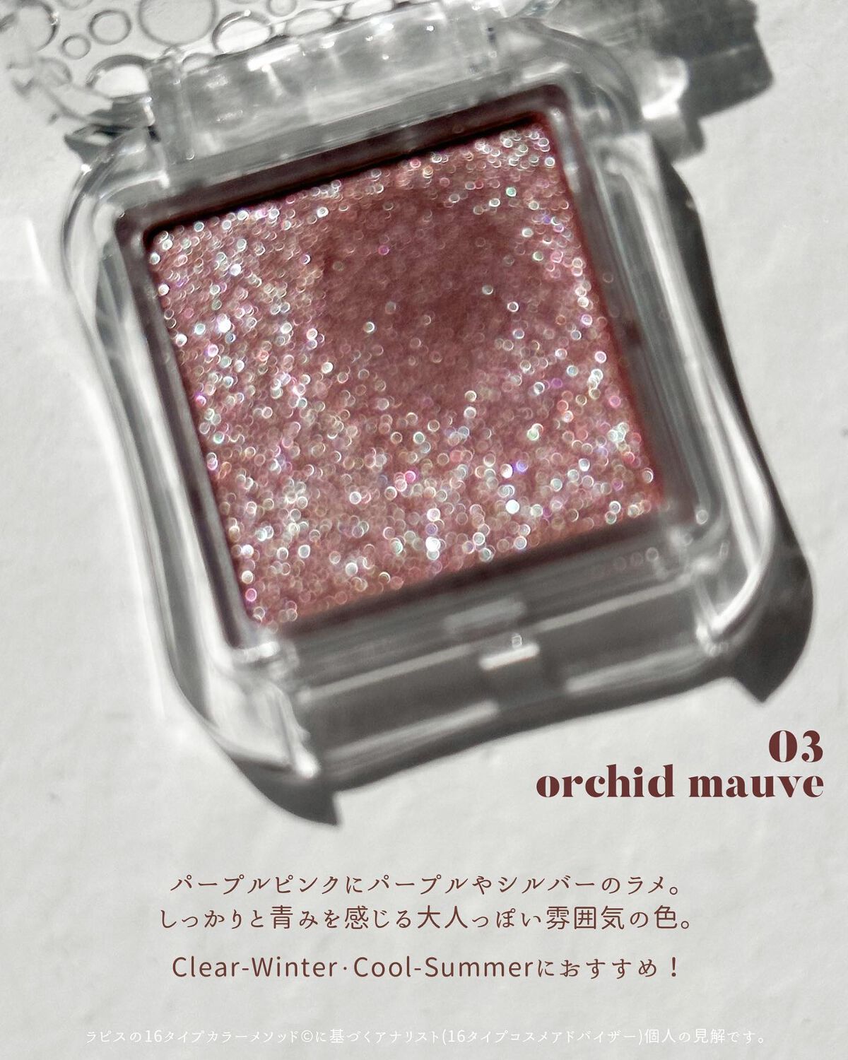 - 夜景を閉じ込めたような輝き まばゆくまぶたを照らす、シングルアイシャドウ まるで夜景みたいにキラキラと輝く、高輝度ラメ配合のシングルアイシャドウ。 なめらかに伸びるしっとりとした粉質なので、ムラになりにくくキレイな仕上がりが長時間続きます。 POINT 指塗りがオススメです! 指に乗ったパールがそのまままぶたに密着し、最大限パールを肌に乗せることができます。 製法の特性上、使い初めと色味やラメ感に違いがあるように見える場合がありますが、品質上問題はありません。